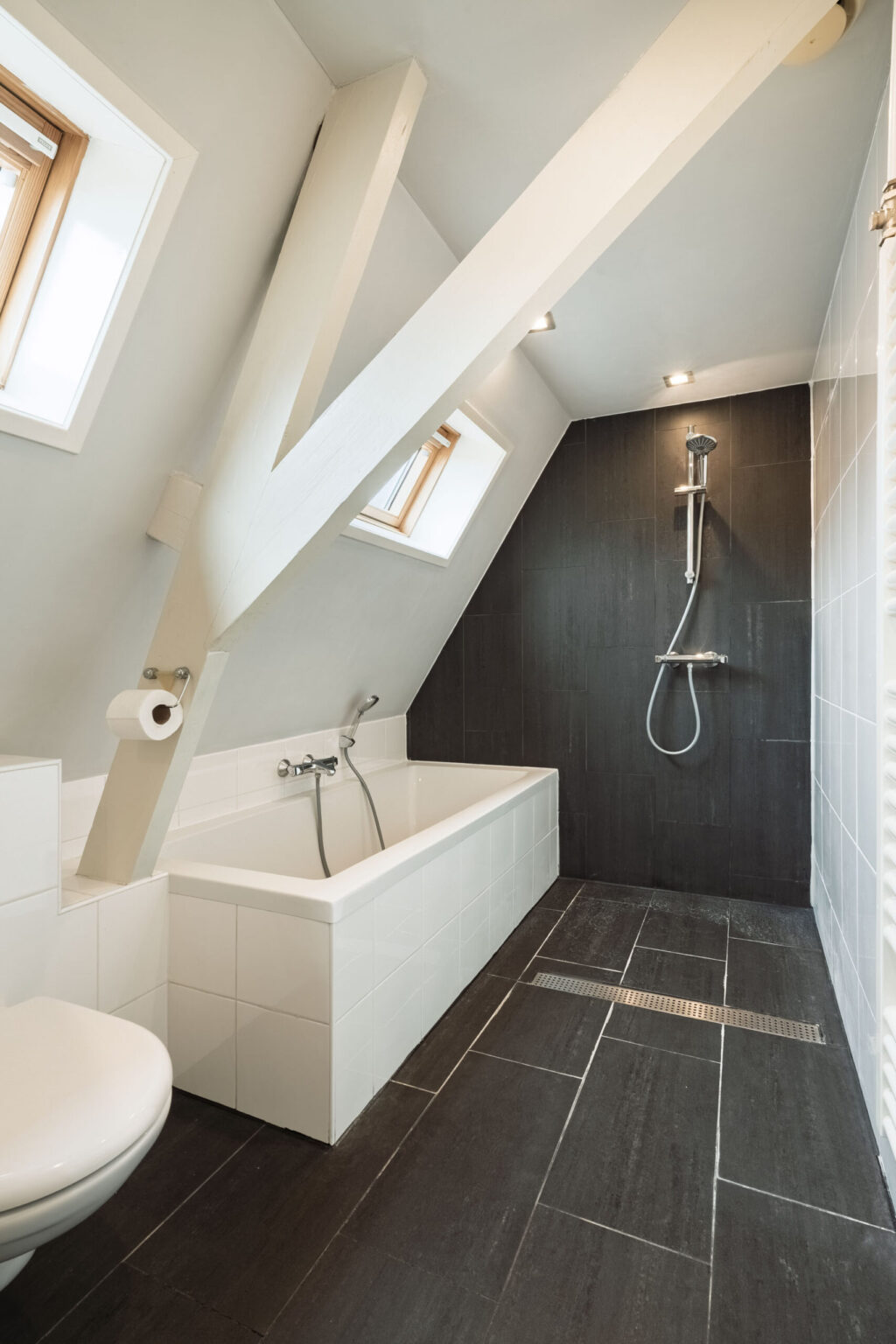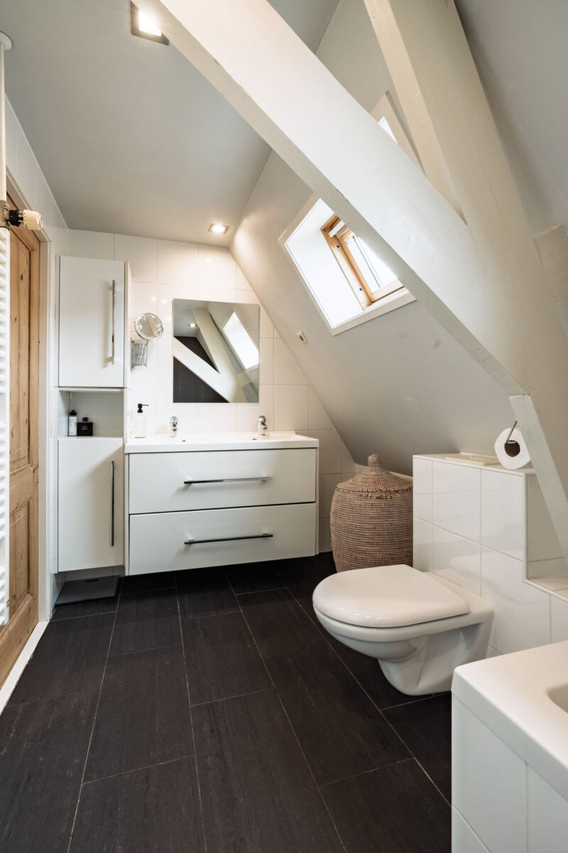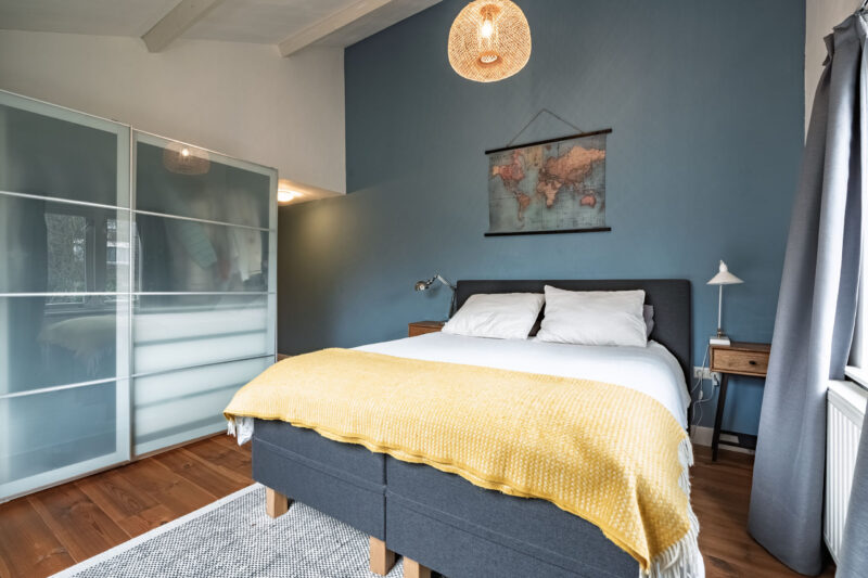 Verdieping: via de overloop, waar zich een luik naar de vliering bevindt, zijn de verschillende vertrekken bereikbaar. Aan de voorzijde van de woning ligt een ruime tweepersoonsslaapkamer. De moderne en complete badkamer is voorzien van een inloopdouche, ligbad en een wastafelmeubel met dubbele wastafel. Daarnaast is er een tweede slaapkamer met een vaste kast en een derde, royale slaapkamer gelegen aan de achterzijde van de woning.