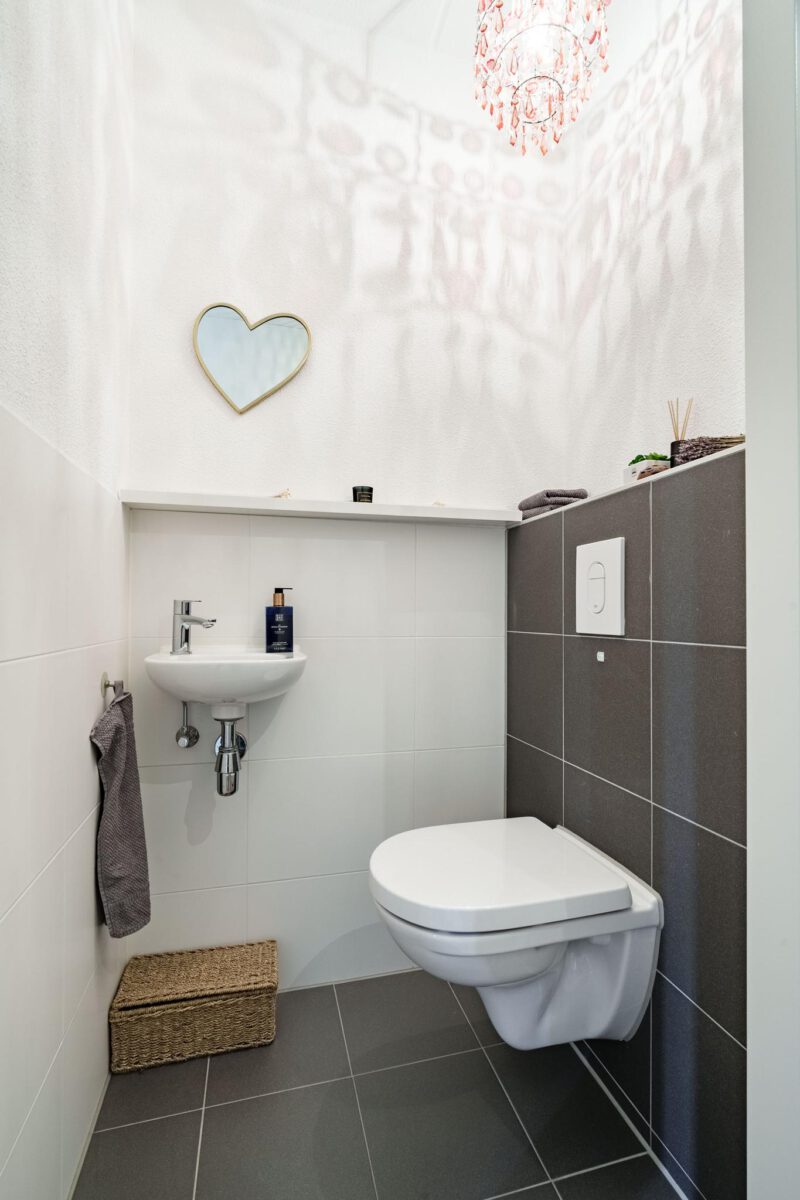 Wanneer u de woning betreedt treft u in de hal de toiletruimte, voorzien van een zwevend toilet en fonteintje. De ruime, uitgebouwde woonkamer is voorzien van een parketvloer. Door de grote raampartijen en schuifpui valt veel licht in de woning. De open keuken is uitgevoerd in een moderne opstelling en voorzien van diverse inbouwapparatuur, waaronder een oven, inductiekookplaat, afzuigkap, koel-/vriescombinatie en vaatwasser. Onder de trap bevindt zich een praktische bergkast met de opstelling van de warmtepomp.