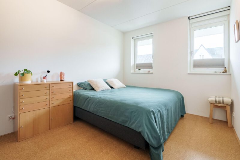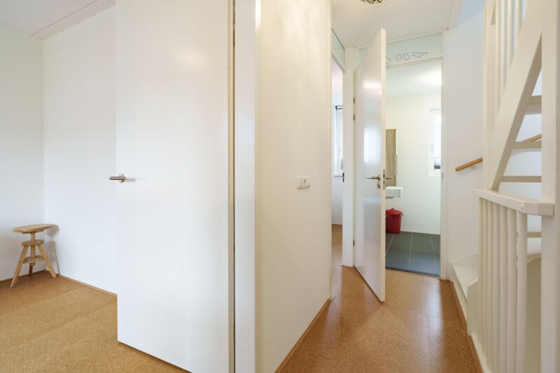 Op de eerste verdieping bevinden zich drie slaapkamers. De vloer is voorzien van kurk wat een warme, natuurlijke uitstraling geeft. De netjes afgewerkte badkamer is betegeld tot het plafond en uitgerust met een hangend toilet, een wastafel, wandkast en inloopdouche.