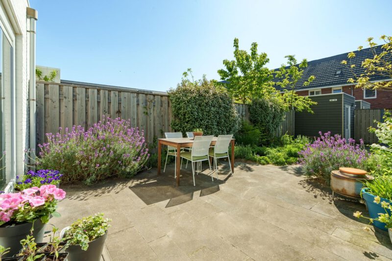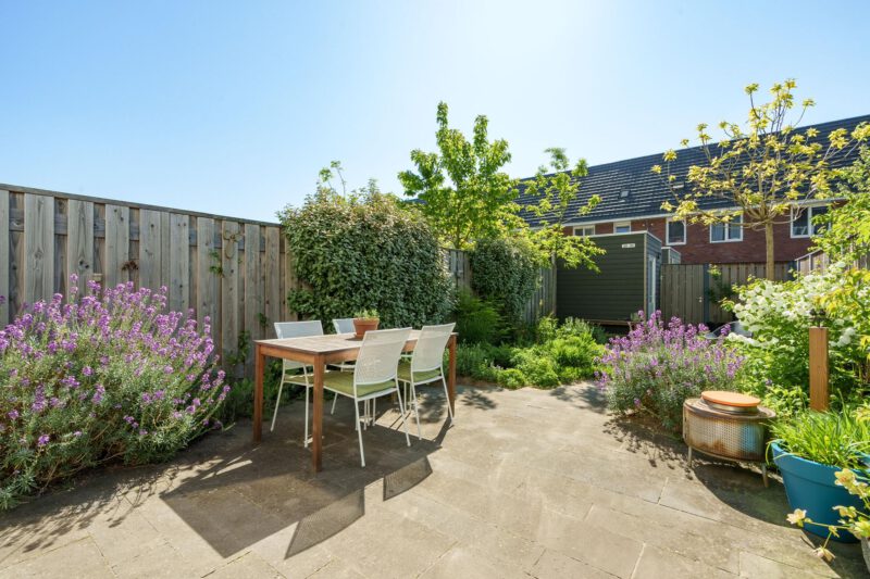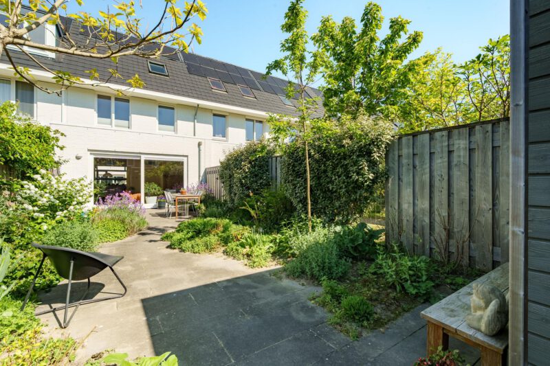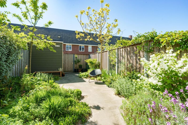 De diepe, groene achtertuin is professioneel aangelegd en goed onderhouden. De tuin is gelegen op het zuiden en beschikt over een houten berging en achterom.