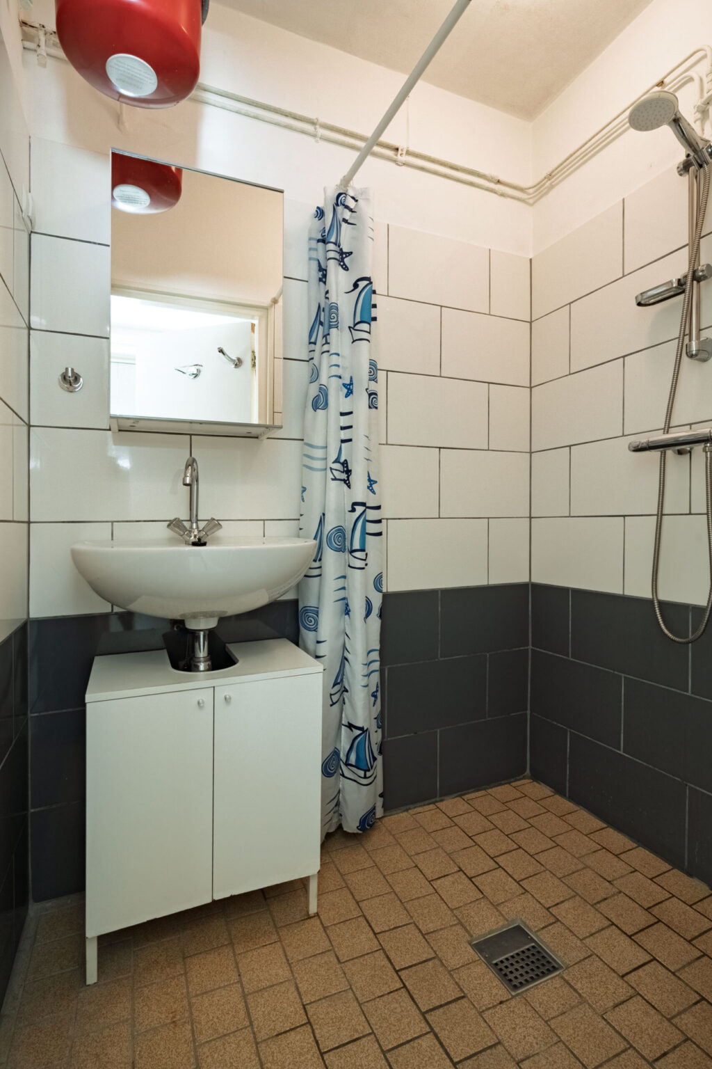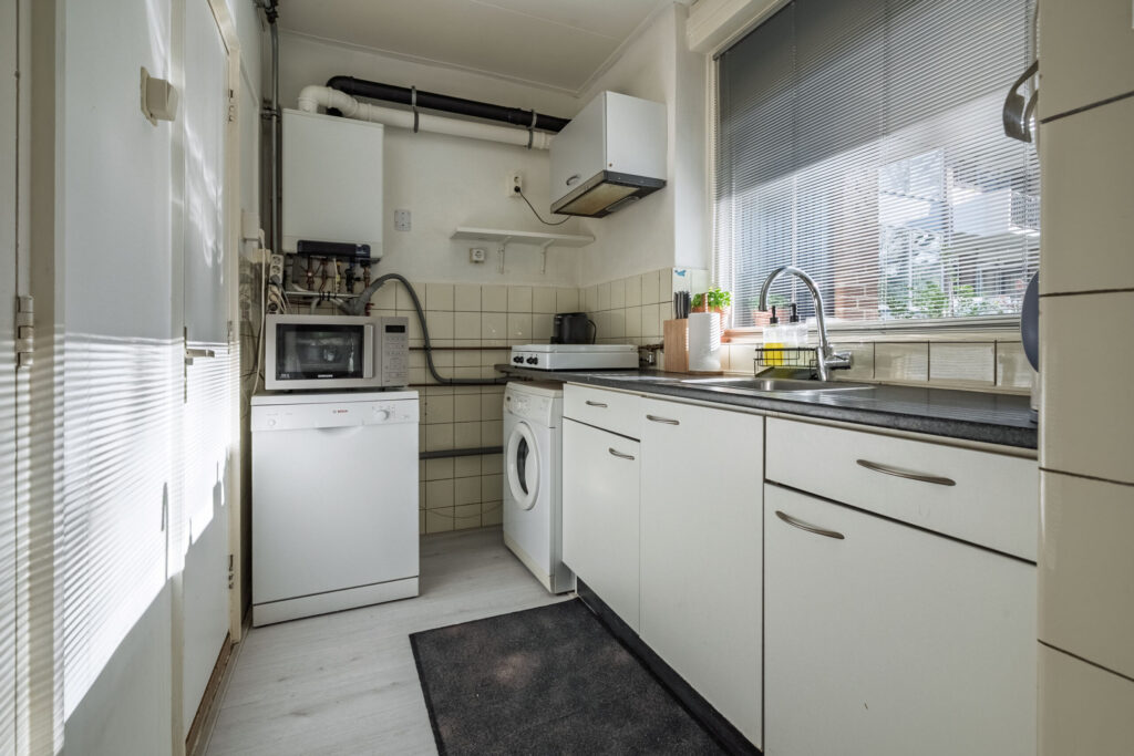 De keuken is voorzien van een afzuigkap, gaskookplaat, koelkast, vriezer, vaatwasser en een combimagnetron. Ook bevindt zich hier de aansluiting voor wasapparatuur. De keuken grenst aan de betegelde badkamer die voorzien is van een wastafel en inloopdouche.