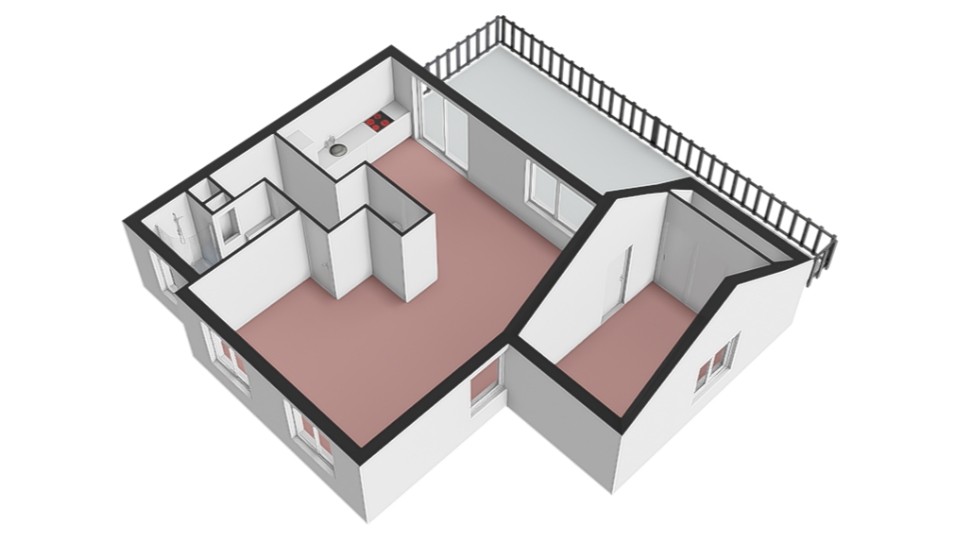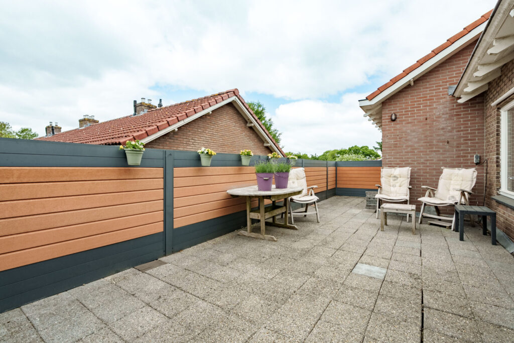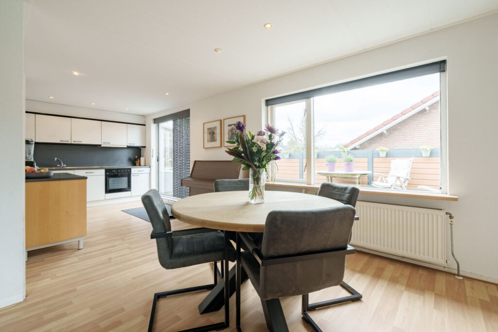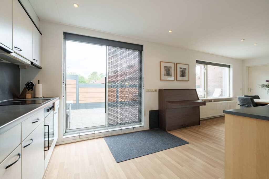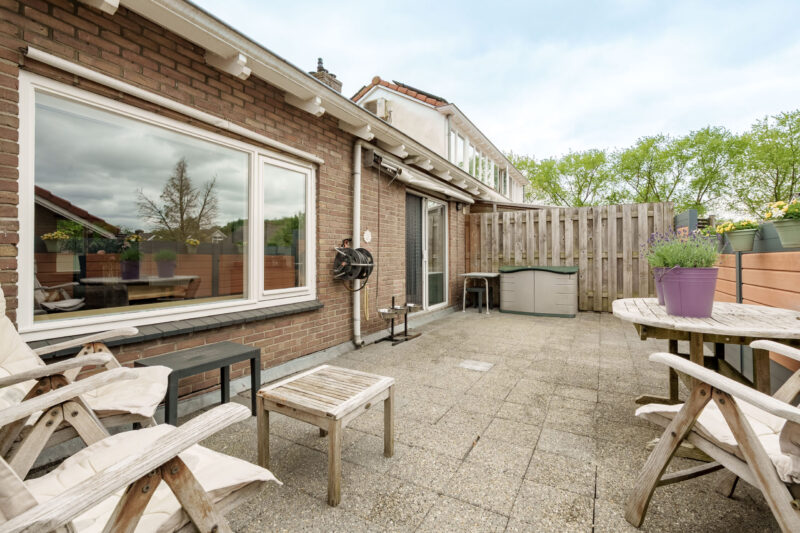 1e woonlaag: een riante woonkamer, keuken, badkamer, slaapkamer en een groot dakterras.