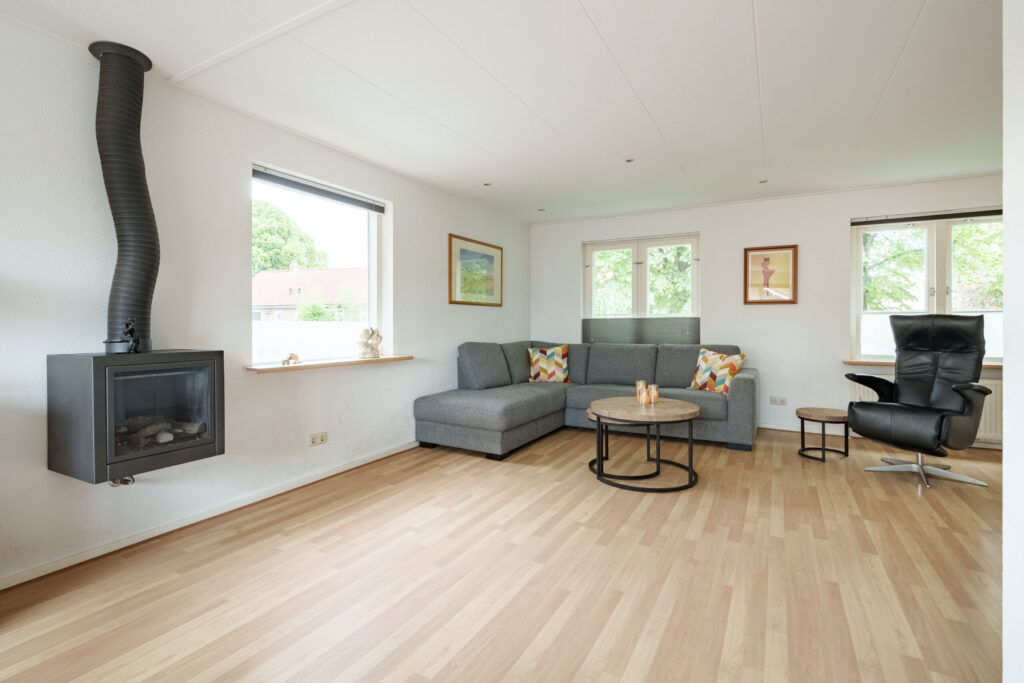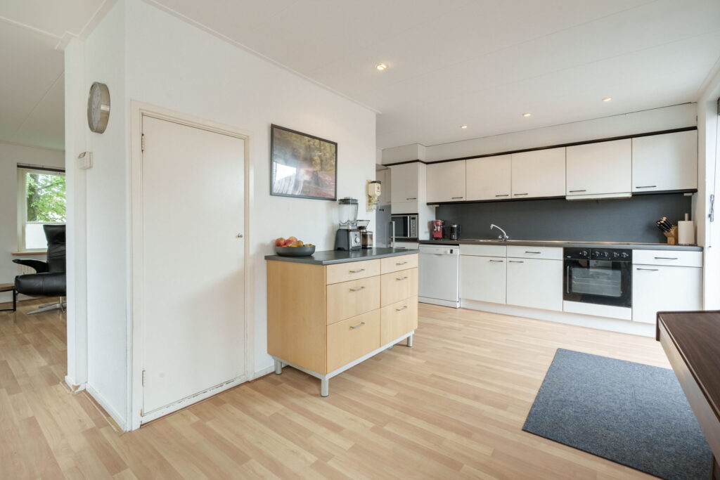 Overloop, een riante en lichte woonkamer met een gashaard, open keuken met toegang tot het grote dakterras. De keuken is voorzien van een keukenopstelling met apparatuur: elektrische kookplaat, afzuigkap en een oven.
