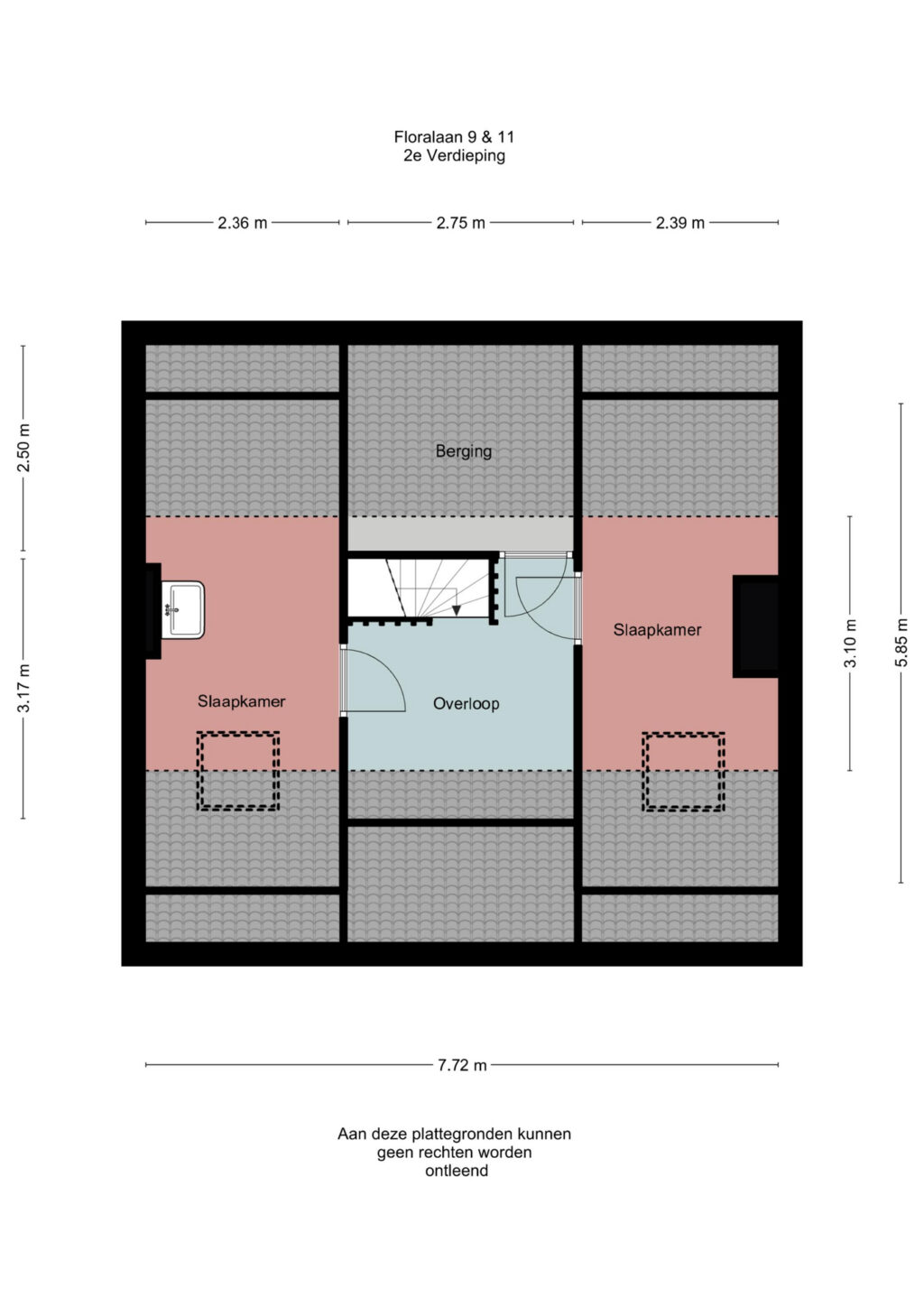 2e woonlaag: overloop, twee slaapkamers, extra bergruimte.