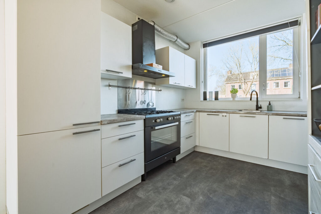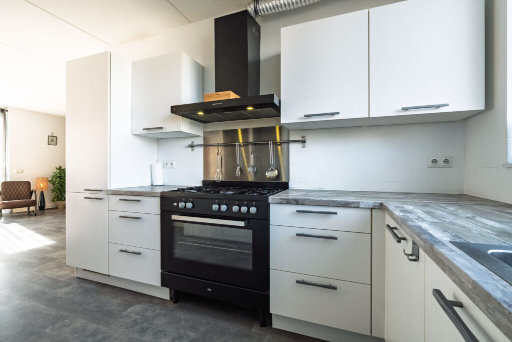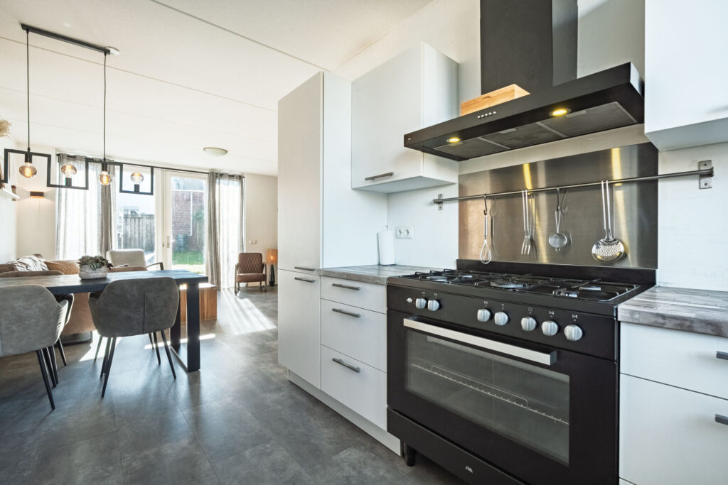 De keuken is gesitueerd aan de voorzijde van de woning en is voorzien van diverse apparatuur, te weten: een gasfornuis, afzuigkap, oven, koel-/vriescombinatie en een vaatwasser.
