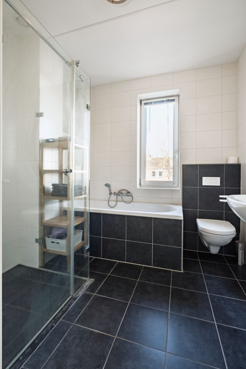 De overloop geeft toegang tot drie slaapkamers. De slaapkamers zijn stuk voor stuk licht en praktisch in te delen. De betegelde badkamer is compleet uitgevoerd en voorzien van een inloopdouche, ligbad, zwevend toilet en een wastafel.