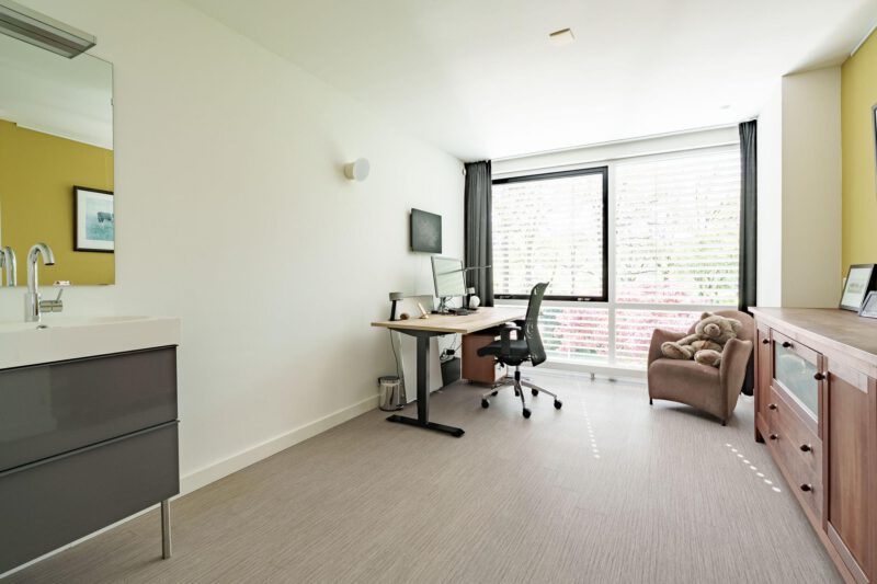 Verdieping: royale overloop, welke toegang biedt tot: werkkamer -/ slaapkamer met deur naar het dakterras, ouderslaapkamer met vaste inbouwkasten en openslaande deuren naar Frans balkon, twee ruime slaapkamers waarvan één voorzien van een vaste wastafel. Badkamer voorzien van wastafelmeubel, designradiator, inloopdouche en vrijhangend toilet. Wasruimte voorzien van aanrechtblad met spoelbak en wasapparatuuraansluiting.