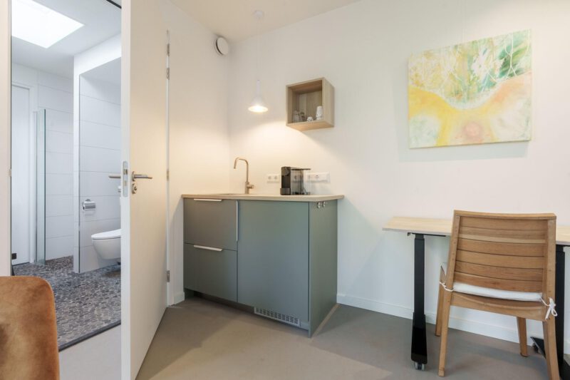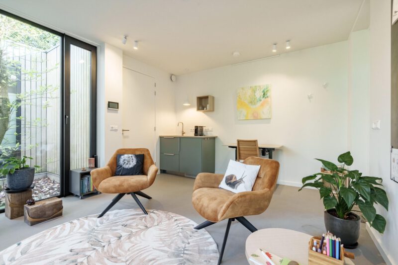 Multifunctioneel bijgebouw: een zelfstandig te gebruiken en af te sluiten studio met pantry, badkamer voorzien van een wastafel, toilet en douche. Grote schuur met carport.