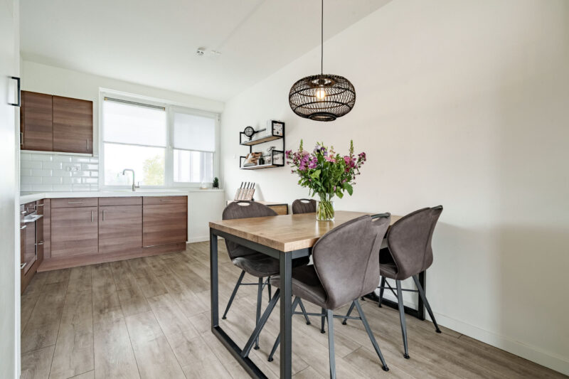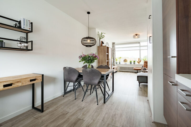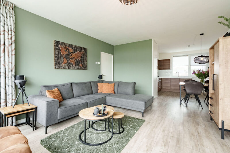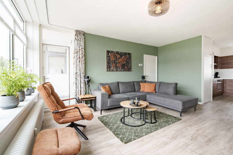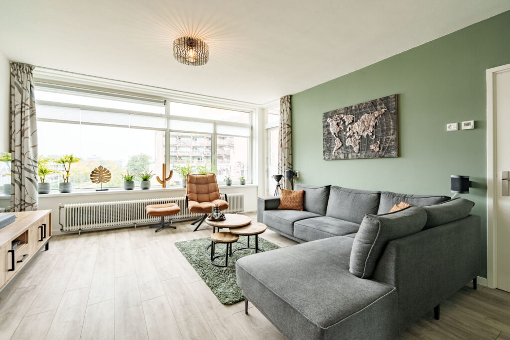 De lichte woonkamer valt direct op door de grote raampartijen aan de achterzijde van het appartement, waardoor er veel natuurlijk daglicht naar binnen valt.