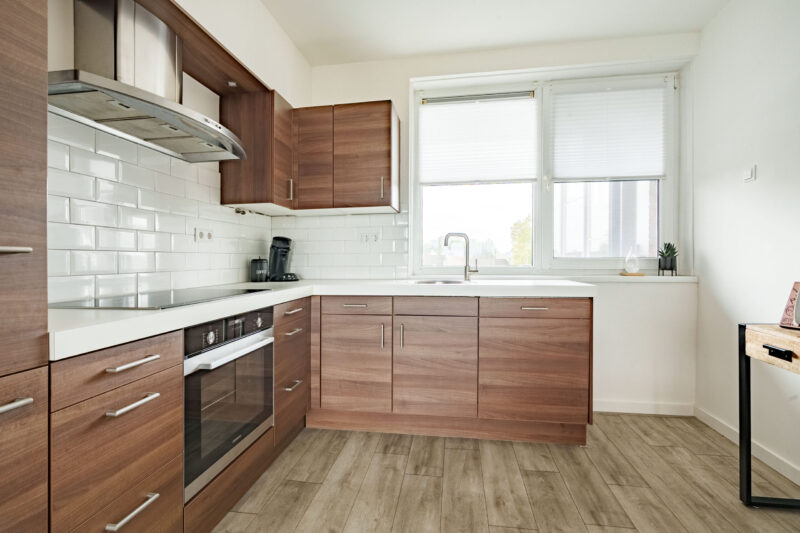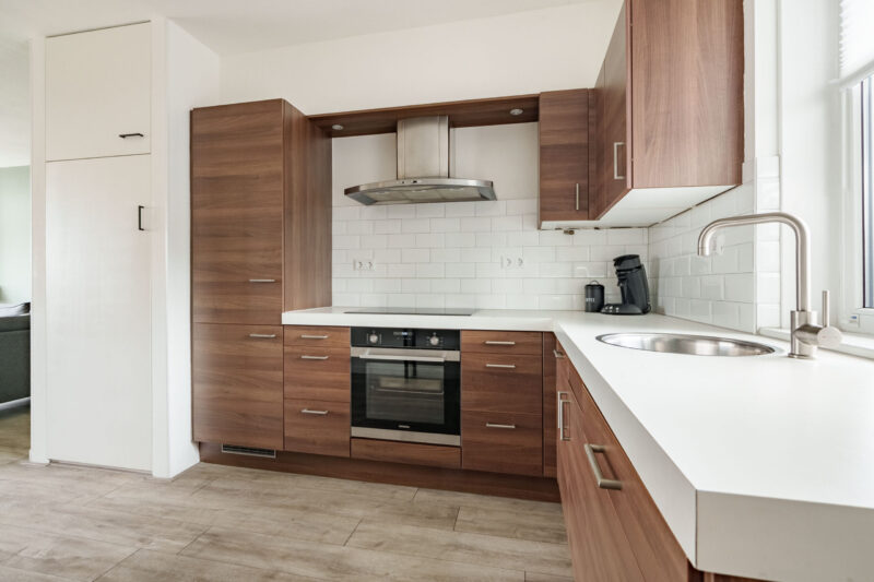 De open keuken is opgesteld in een praktische L-vorm en uitgerust met diverse inbouwapparatuur, waaronder een inductiekookplaat, oven, koel-vriescombinatie en vaatwasser. Ook bevindt zich hier de aansluiting voor de wasmachine in een net afgewerkte gesloten kast.
