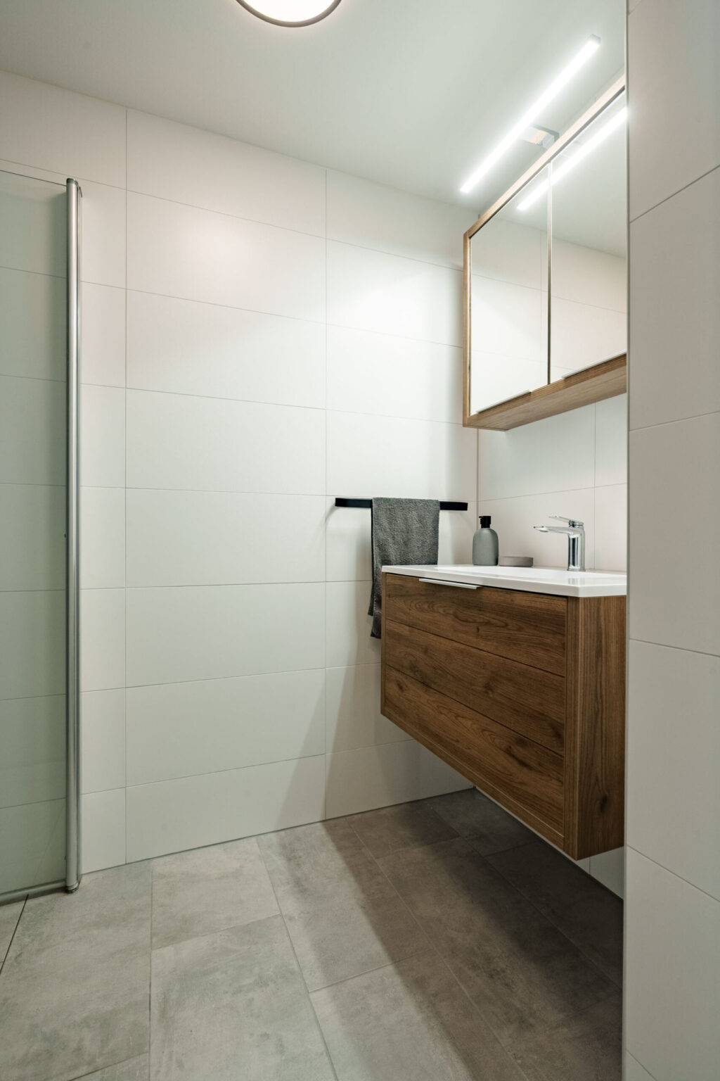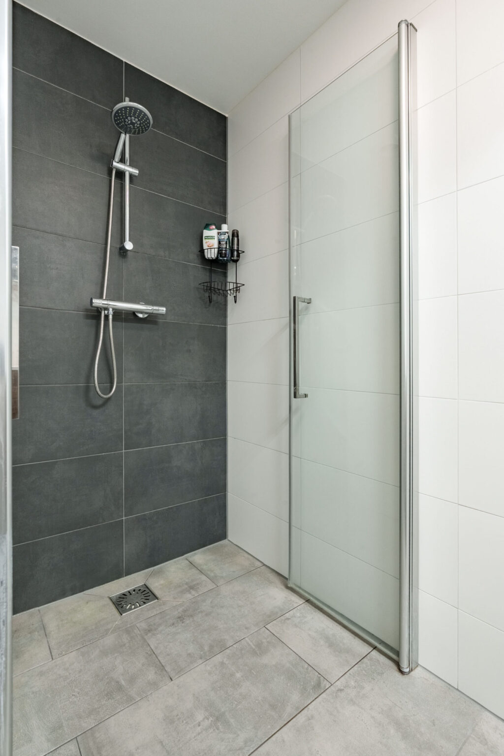 Wanneer je dit appartement binnenstapt, kom je terecht in een ruime hal met toegang tot de toiletruimte met toilet en fonteintje en de badkamer, voorzien van een inloopdouche en een wastafel met modern meubel. Vanuit de hal zijn de woonkamer en slaapkamers evenals bereikbaar.