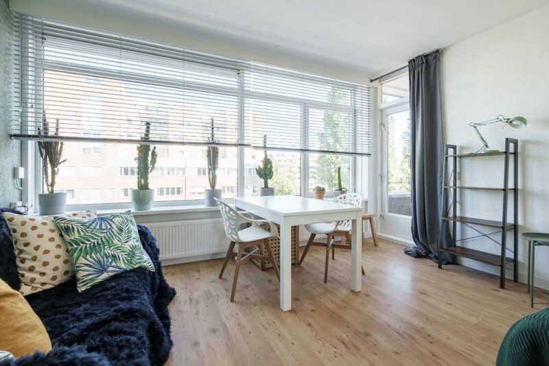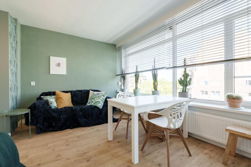 De lichte woonkamer heeft een groot raampartij en toegang tot het balkon.