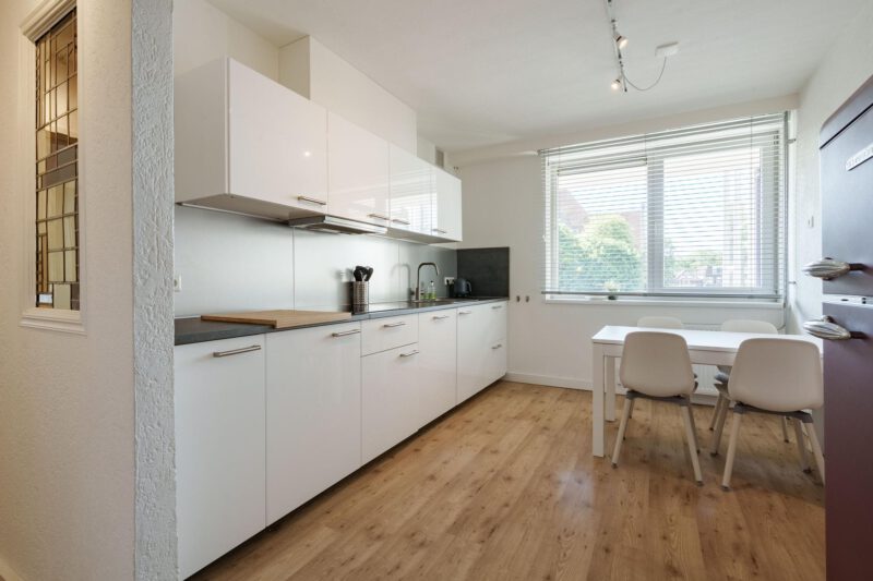 Tegenover de woonkamer ligt de moderne eetkeuken met een witte keukenopstelling. De keukenopstelling is voorzien van inbouwapparatuur: ingebouwde inductiekookplaat, een afzuigkap en een geïntegreerde vaatwasser.