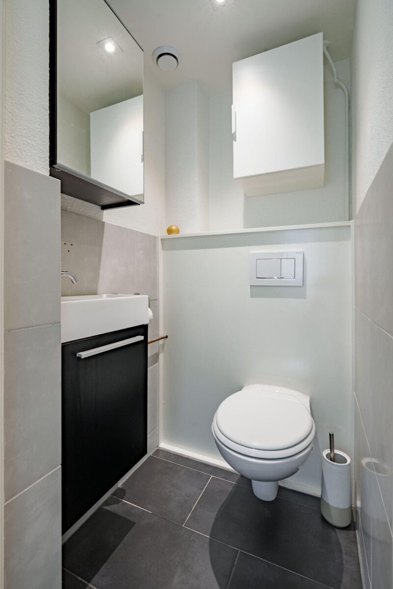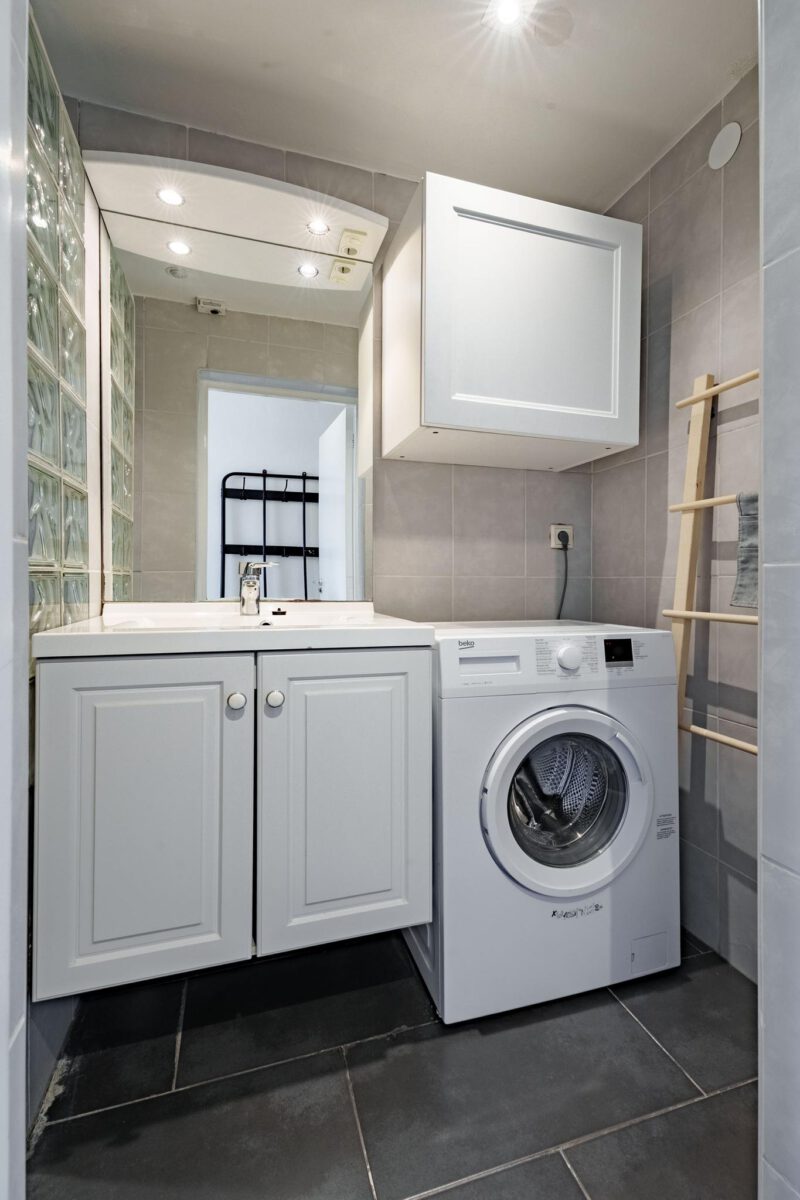 Entree/hal. In de hal vind je aan de linkerzijde de toiletruimte met een wastafelmeubel en een spiegelkast, badkamer met een inloopdouche, wastafelmeubel en aansluitingen voor de wasmachine- en droger.