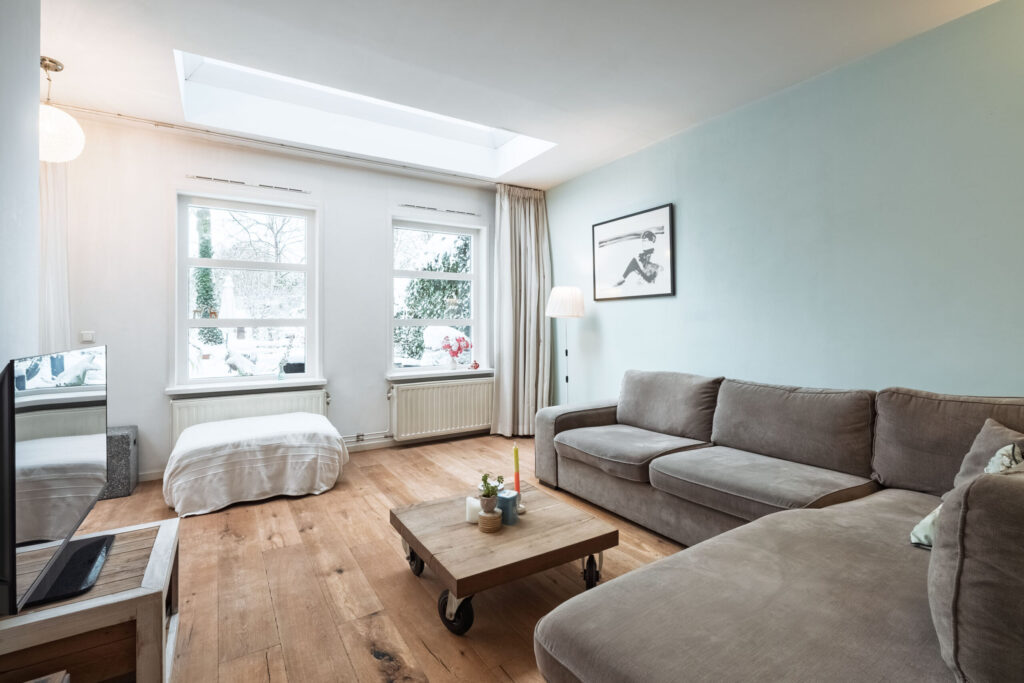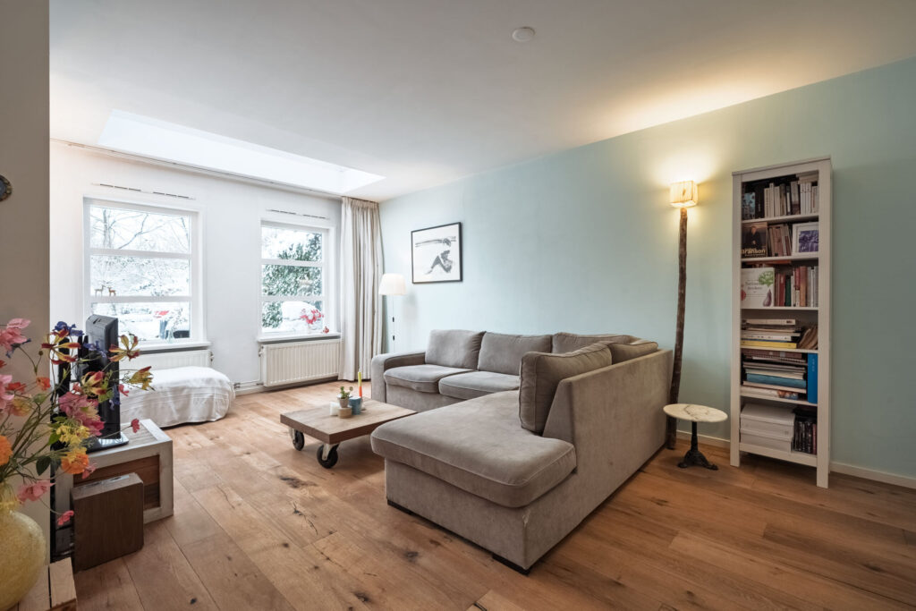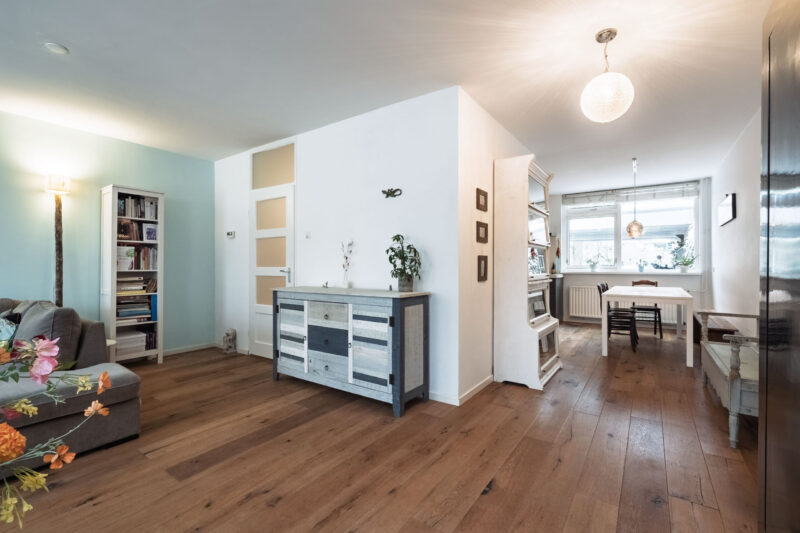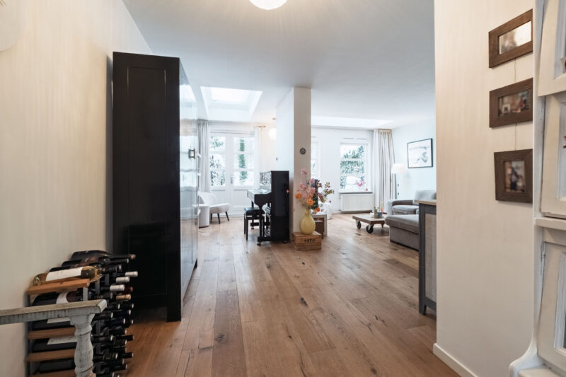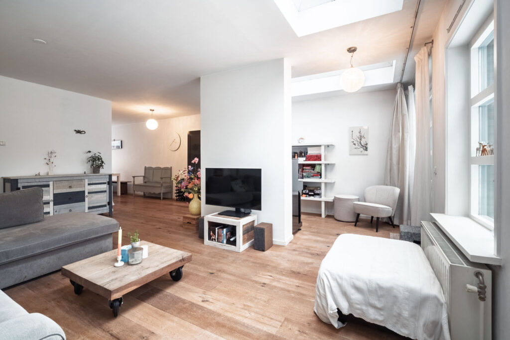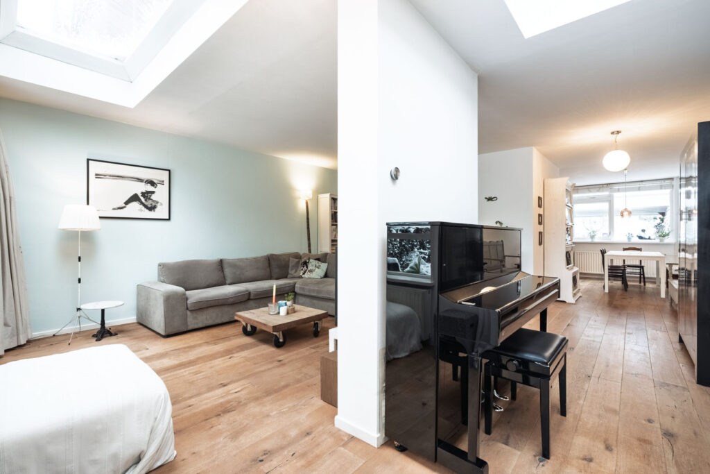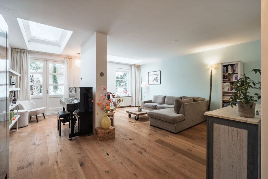 De houten vloer loopt door in de woonkamer, waardoor de begane grond een mooi en samenhangend geheel vormt. De uitgebouwde woonkamer is heerlijk licht dankzij de aanwezige lichtkoepels. Met behulp van een tussenmuur is de ruimte praktisch te verdelen, waardoor er ook plaats is voor bijvoorbeeld een piano of een zitgedeelte. De openslaande deuren en het fraaie zicht op de tuin zorgen voor een prettige verbinding tussen binnen en buiten.