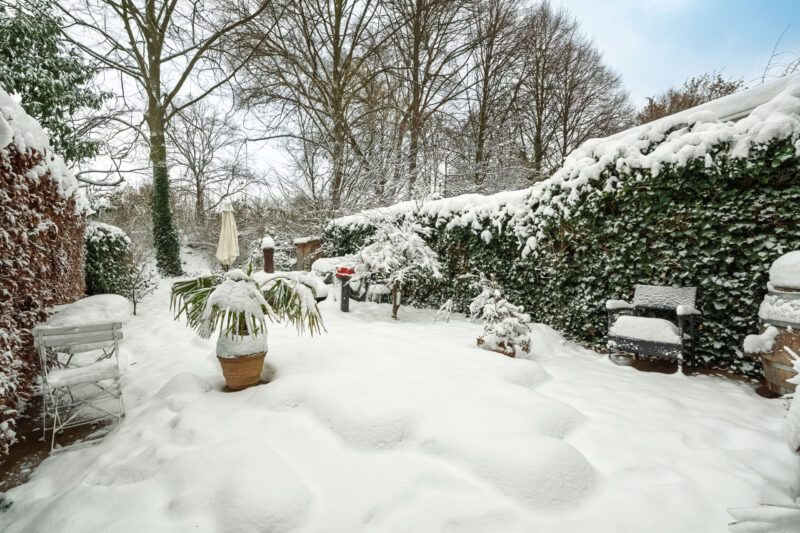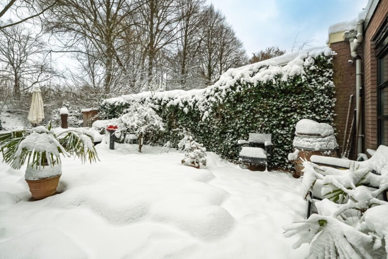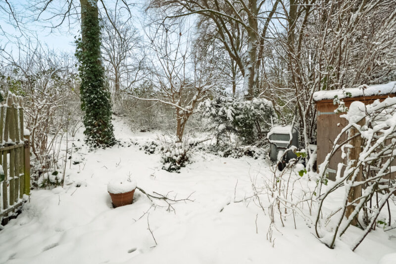 De achtertuin is gelegen op het noorden maar door de diepte komt er toch veel zon in de tuin.