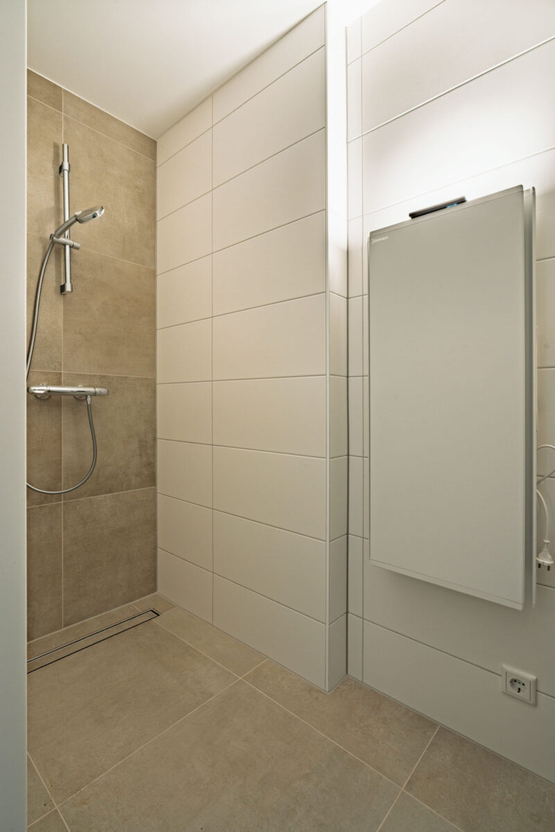 De badkamer/douchegelegenheid heeft een tijdloze en rustige uitstraling met zachte, harmonieuze kleuren.