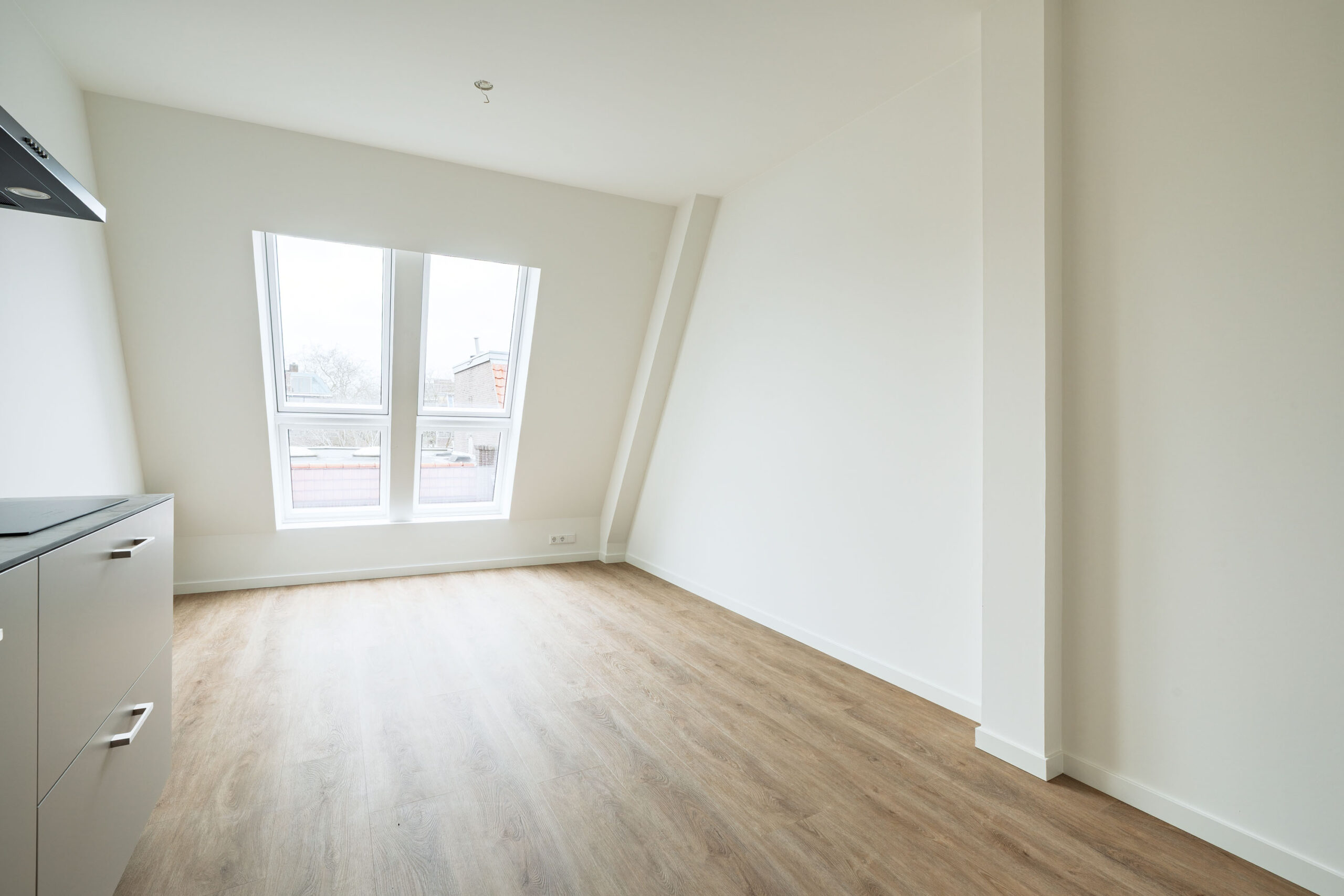 woonkamer met zicht op de Hoogstraat, de hoofdwinkelstraat van Wageningen. De woonkamer is voorzien van een luxe uitgevoerde open keukenopstelling met een diverse inbouwapparatuur, te weten: inductiekookplaat, recirculatiekap, vaatwasser, koelkast en een oven. De tweepersoonsslaapkamer bevindt zich aan de achterzijde (aan de Herenstraat-zijde).