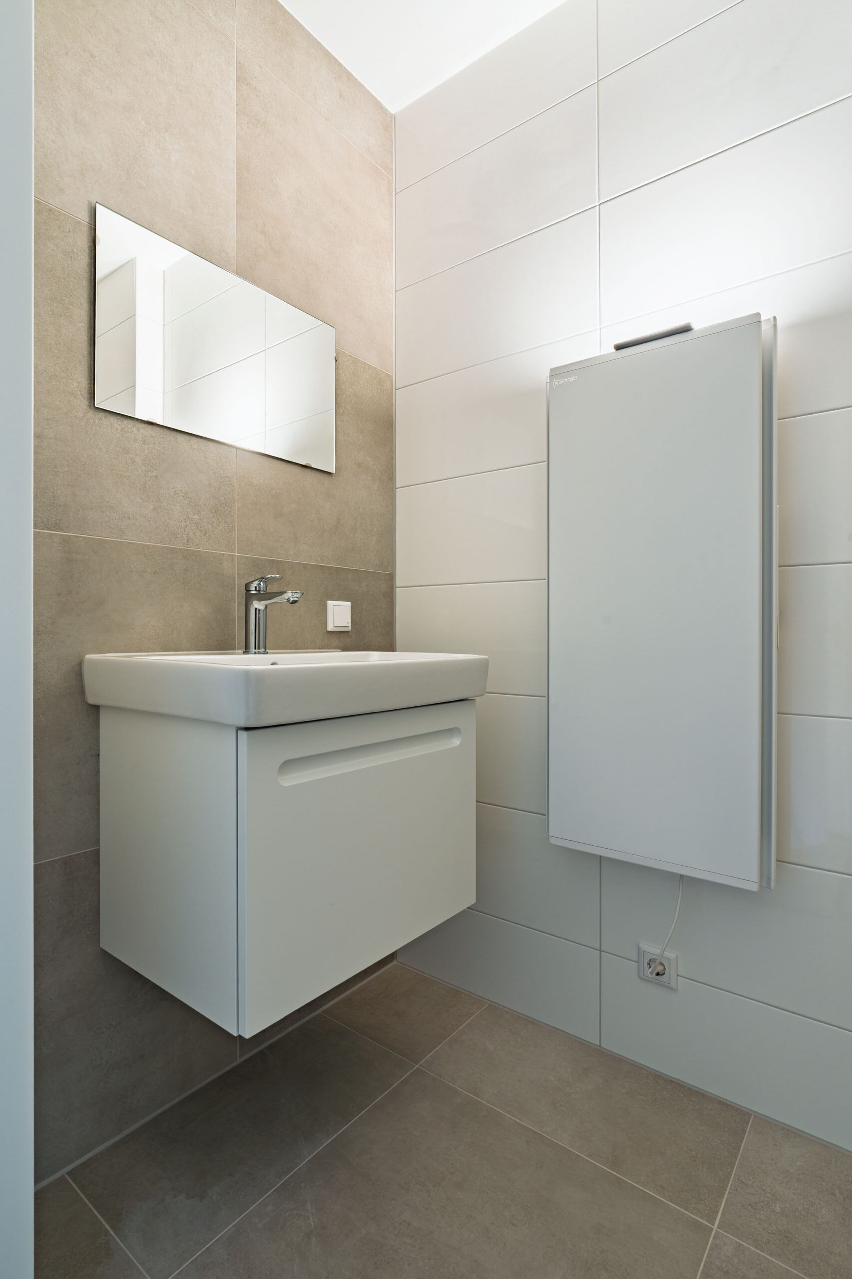 Luxe badkamer/douchegelegenheid met een wastafelmeubel, een spiegel, radiator en een inloopdouche, een lichte