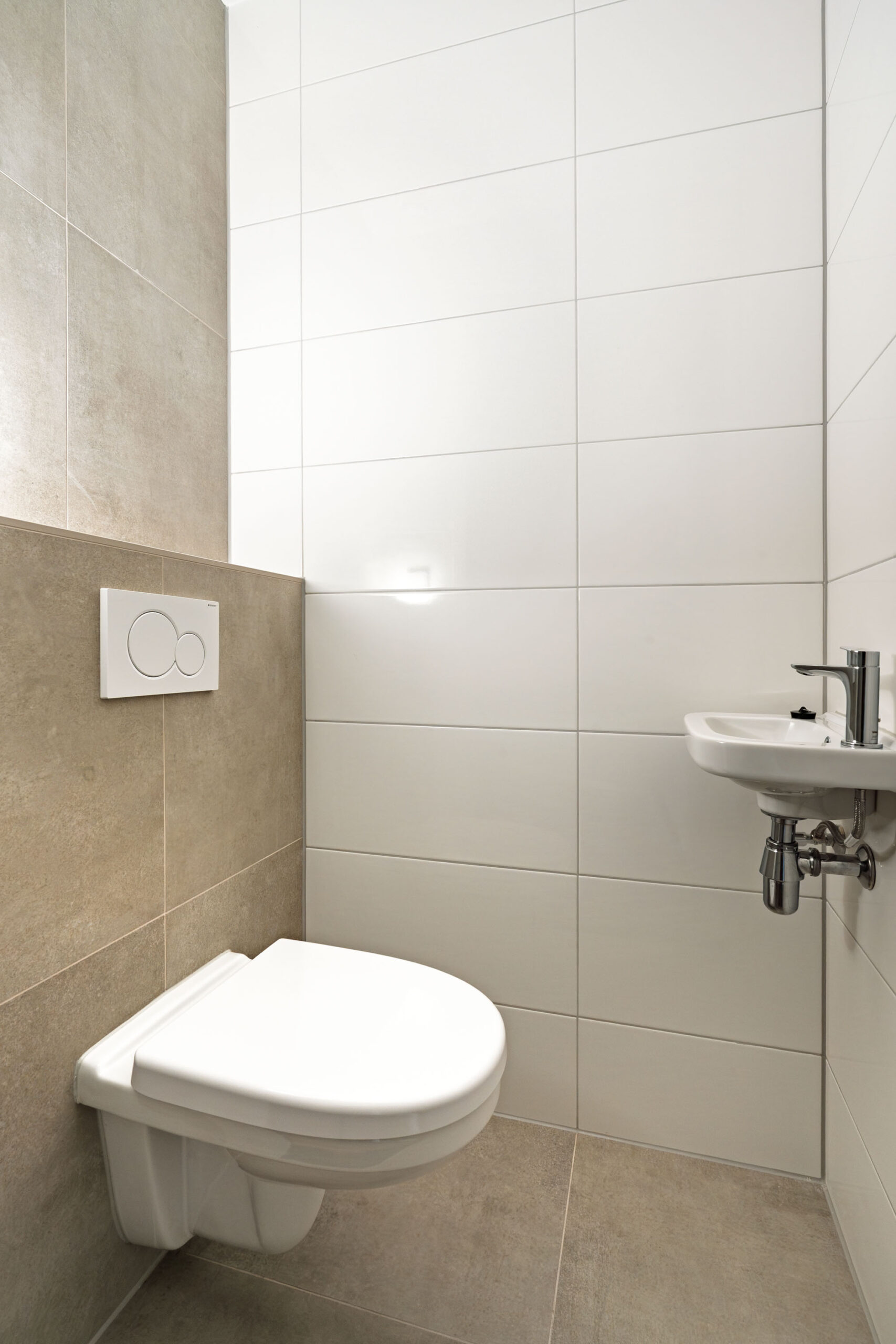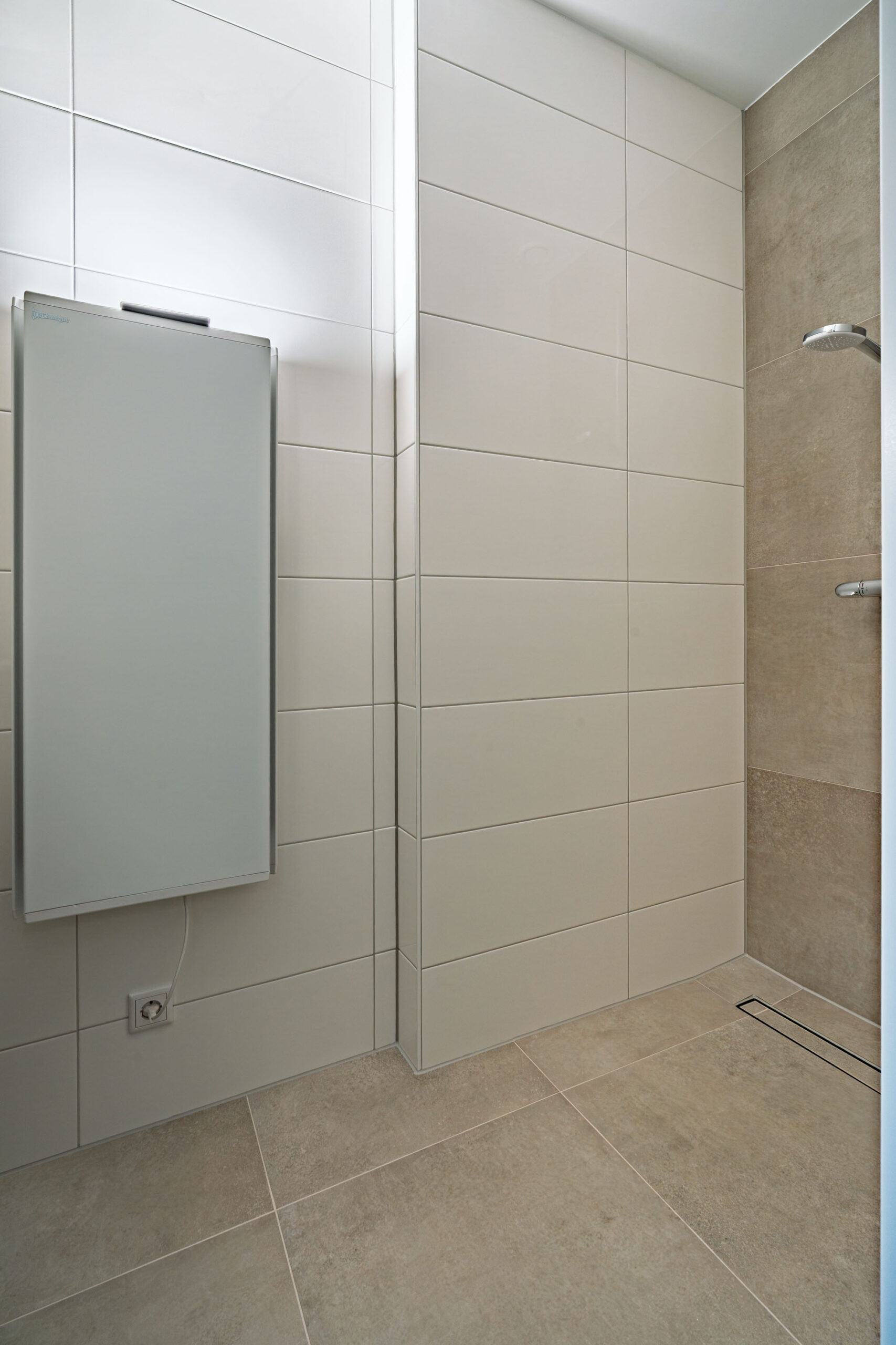 De badkamer/douchegelegenheid heeft een tijdloze en rustige uitstraling met zachte, harmonieuze kleuren.