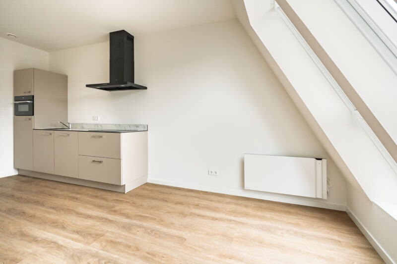 woonkamer met zicht op de Hoogstraat, de hoofdwinkelstraat van Wageningen. De woonkamer is voorzien van een luxe uitgevoerde open keukenopstelling met een diverse inbouwapparatuur, te weten: inductiekookplaat, recirculatiekap, vaatwasser, koelkast en een oven. De tweepersoonsslaapkamer bevindt zich aan de achterzijde (aan de Herenstraat-zijde).