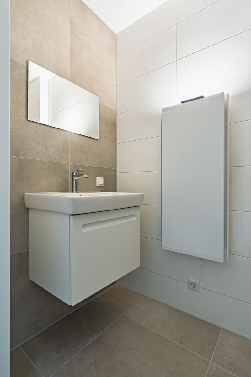 De badkamer/douchegelegenheid heeft een tijdloze en rustige uitstraling met zachte, harmonieuze kleuren.