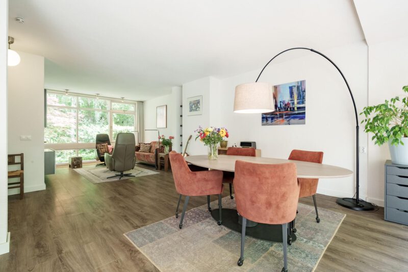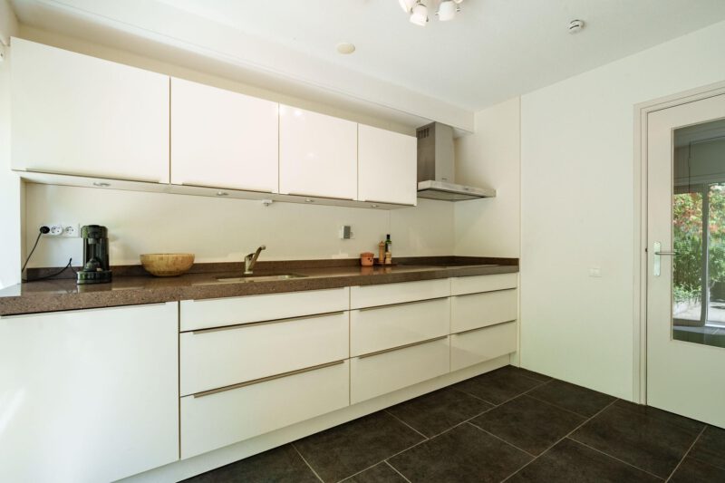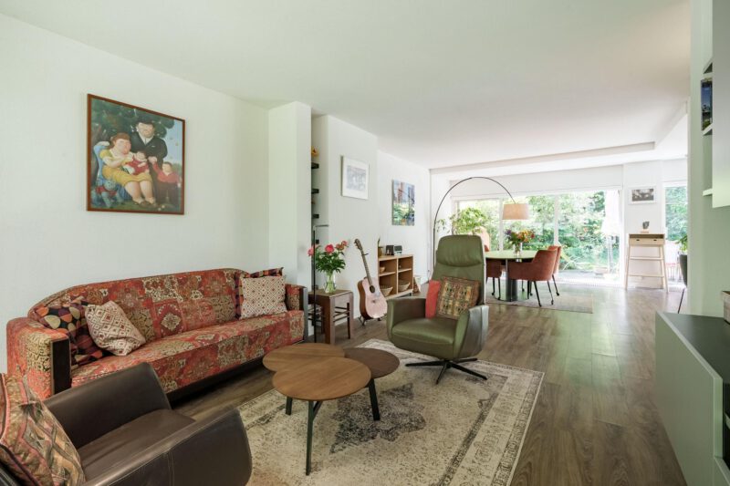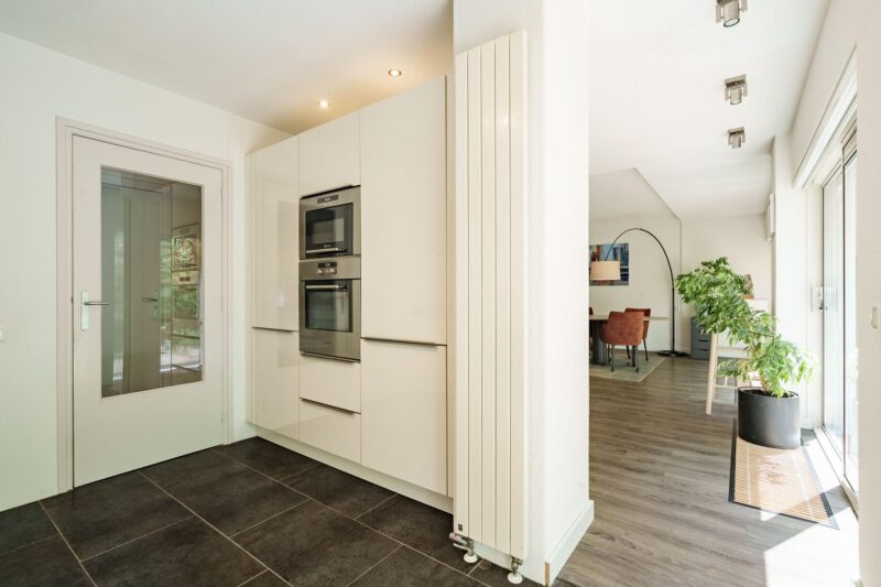 De lichte, ruime woonkamer is voorzien van een donkere eiken pvc-vloer en strak afgewerkte wanden. Dankzij de grote raampartijen aan de voor- en achterzijde van de woning komt er veel daglicht binnen en is er prachtig zicht op de voor- en achtertuin. Aan de woonkamer grenst direct de halfopen keuken. De moderne keuken heeft een breed aanrecht en is uitgerust met een inductiekookplaat, afzuigkap, vaatwasser, magnetron, oven, koel-vriescombinatie en close-in boiler. De verbinding met de tuin via 2 grote moderne aluminium schuifpuien in keuken en woonkamer versterkt het binnen-buiten gevoel.
