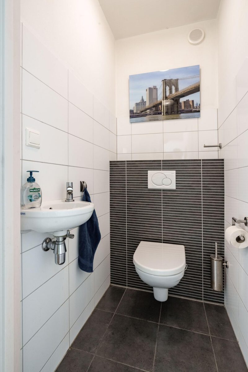 Bij binnenkomst komt u in een ruime hal met trapopgang. In de hal bevinden zich de meterkast (12 groepen en een slimme meter) en een moderne toiletruimte met toilet en fonteintje. Via de hal heeft u tevens toegang tot de inpandige garage (15,7 m²). De inpandige garage biedt met ruim 15 m2 veel mogelijkheden. Er zijn aansluitingen voor wasmachine, droger en een vriezer (3 aparte groepen). De buitendeur is elektrisch bedienbaar.