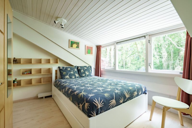 De woning beschikt over vier lichte, ruime slaapkamers met laminaatvloeren en vaste kasten. De slaapkamers aan de voorzijde van de woning beschikken over dakkapellen, wat zorgt voor extra ruimte en lichtinval. De ouderslaapkamer beschikt over een maatwerk-inbouwkastenwand met matglazen Coral schuifdeuren en een hordeur op de schuifpui. Twee slaapkamers geven toegang tot een ruim balkon.