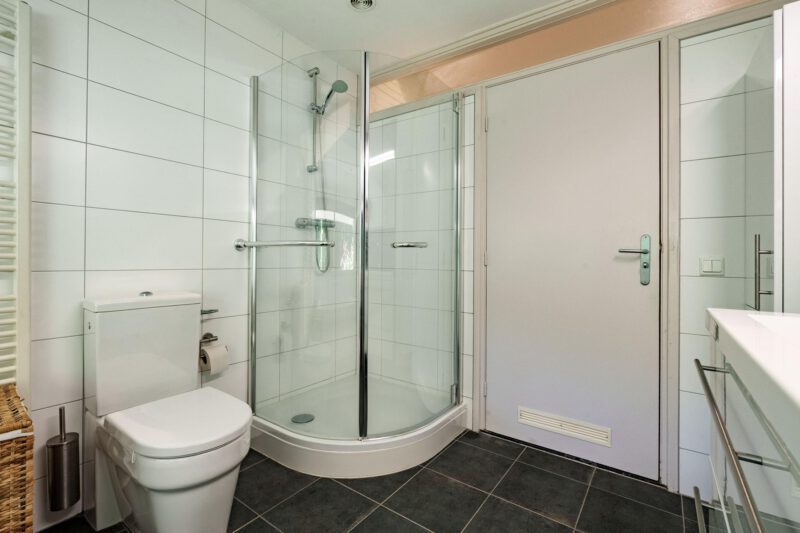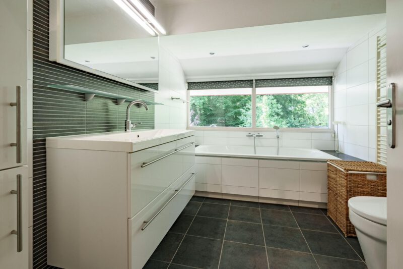De badkamer is voorzien van een dubbel wastafelmeubel, een duo-ligbad, een tweede toilet en een douchecabine.