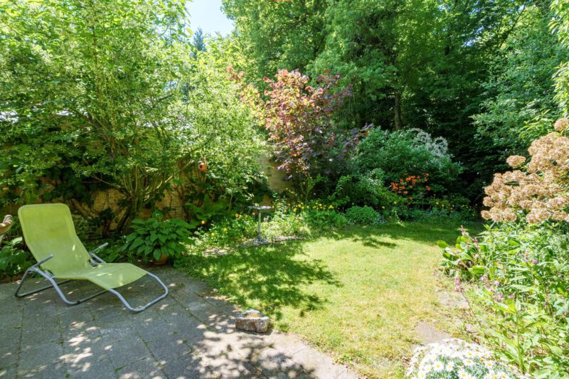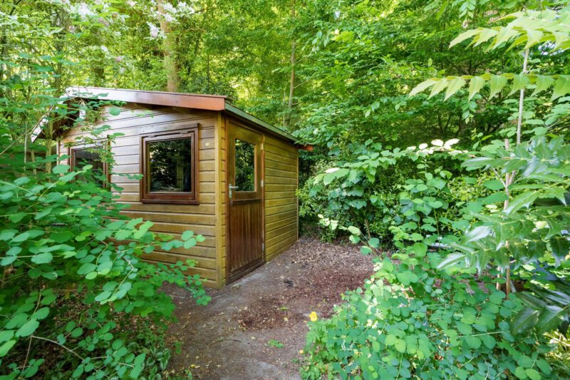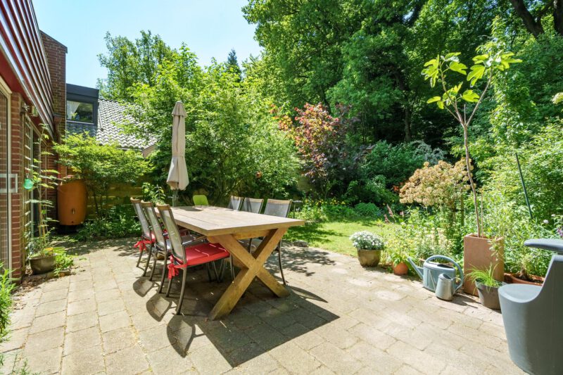 De riante, groene tuin ligt op het zuidwesten, waardoor er veel zonlicht binnenvalt en het groen volop kan floreren. Van ’s ochtends tot ’s avonds is het heerlijk vertoeven op het terras. Achterin de tuin bevindt zich een houten berging met elektriciteit, die voldoende ruimte biedt voor opslag.