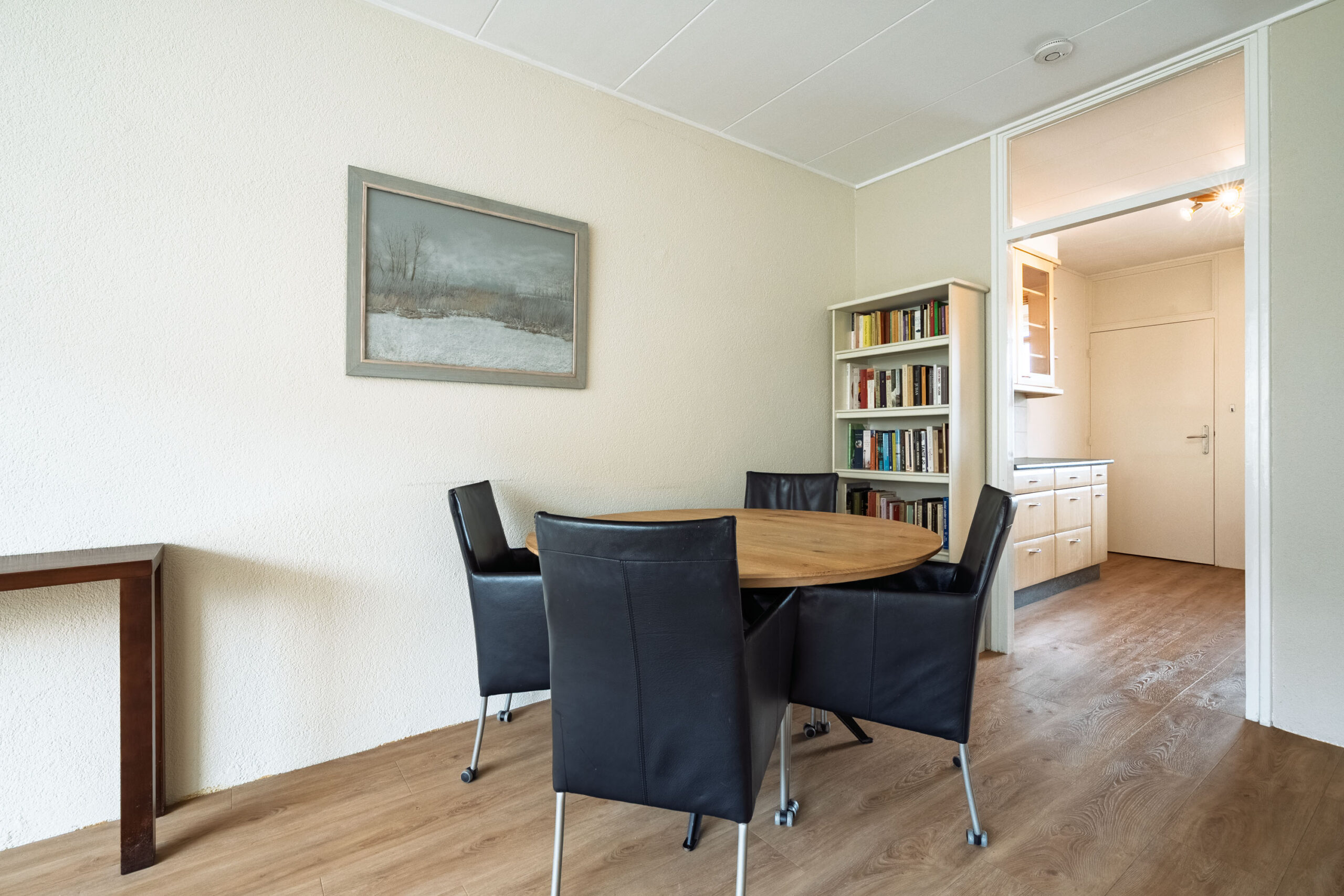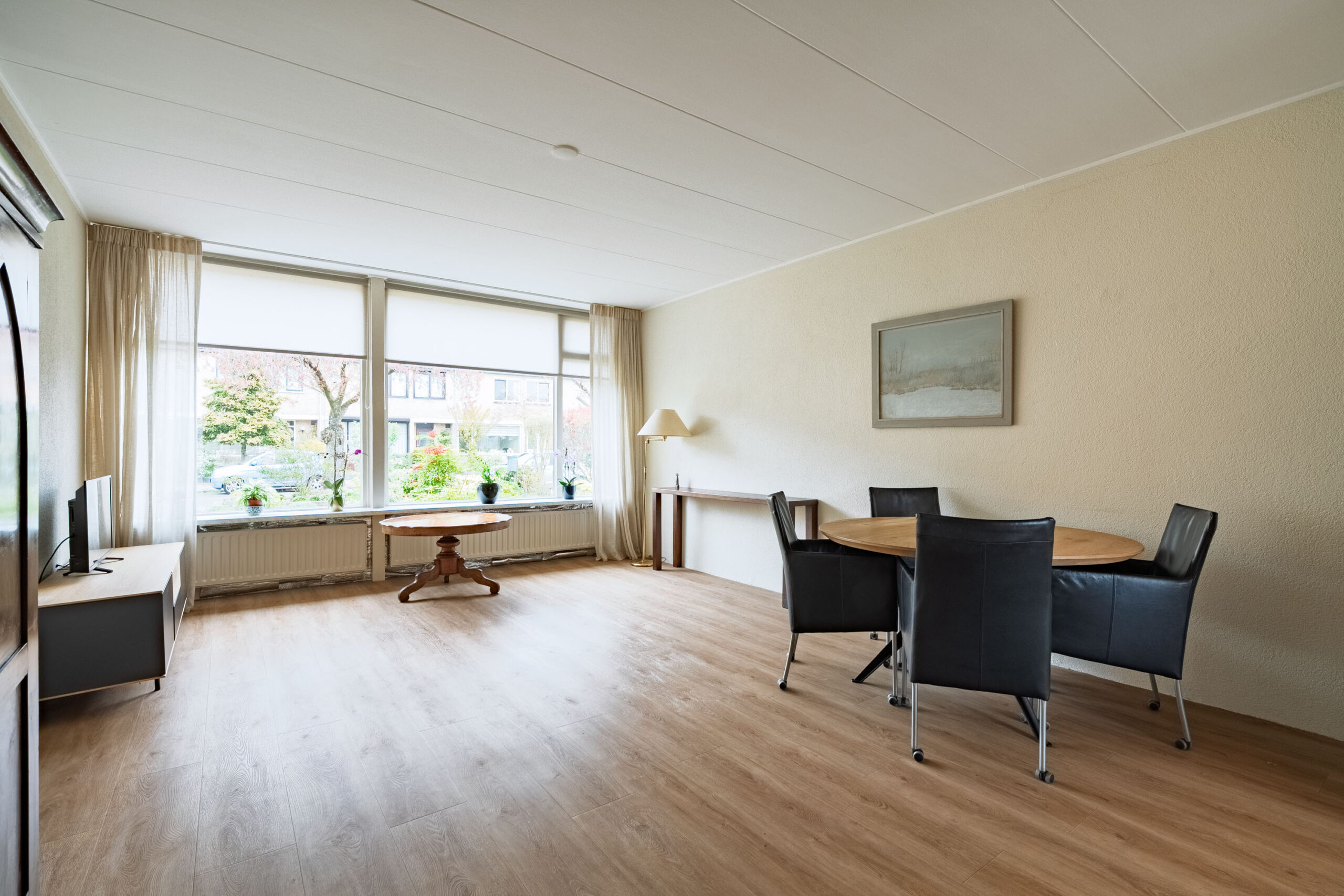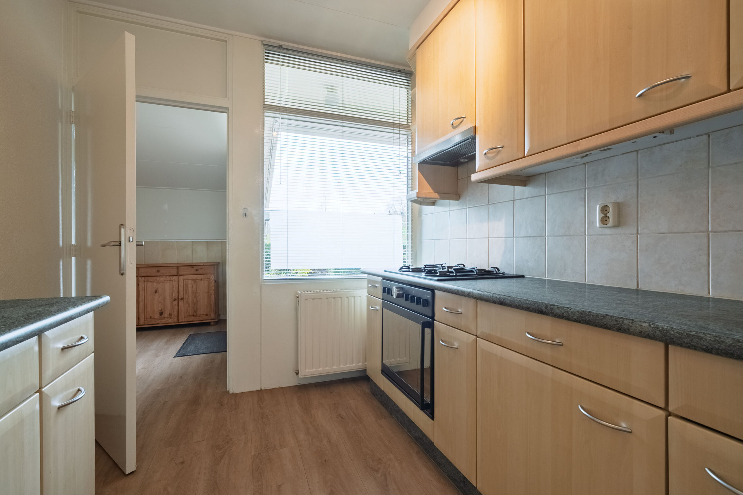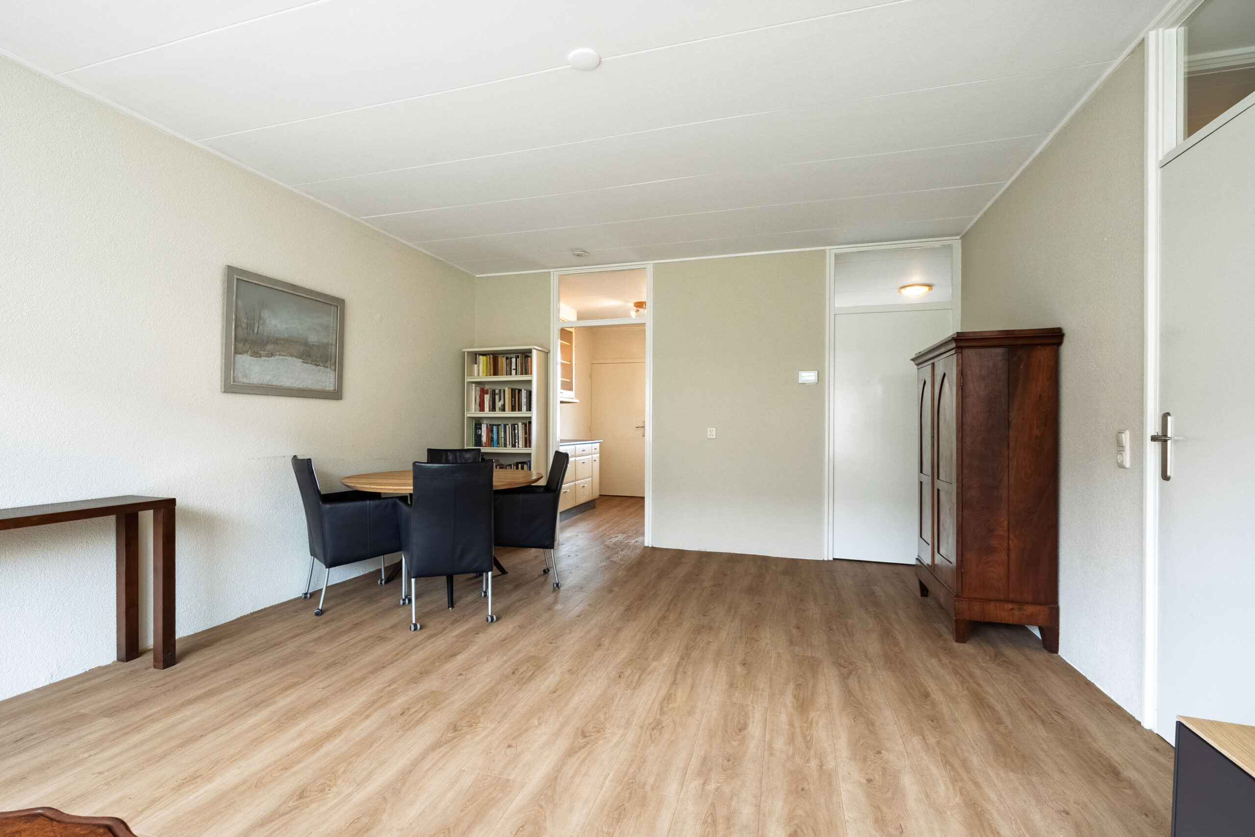 De semi-dichte keuken sluit hier mooi op aan en beschikt over voldoende werkruimte. Daarnaast is er een praktische bijkeuken met directe toegang tot de achtertuin. Verder bevinden zich op de begane grond de ruime slaapkamer met een kledingkast en de badkamer met douche, wastafelmeubel en een toilet Hierdoor maakt comfortabel gelijkvloers wonen mogelijk.