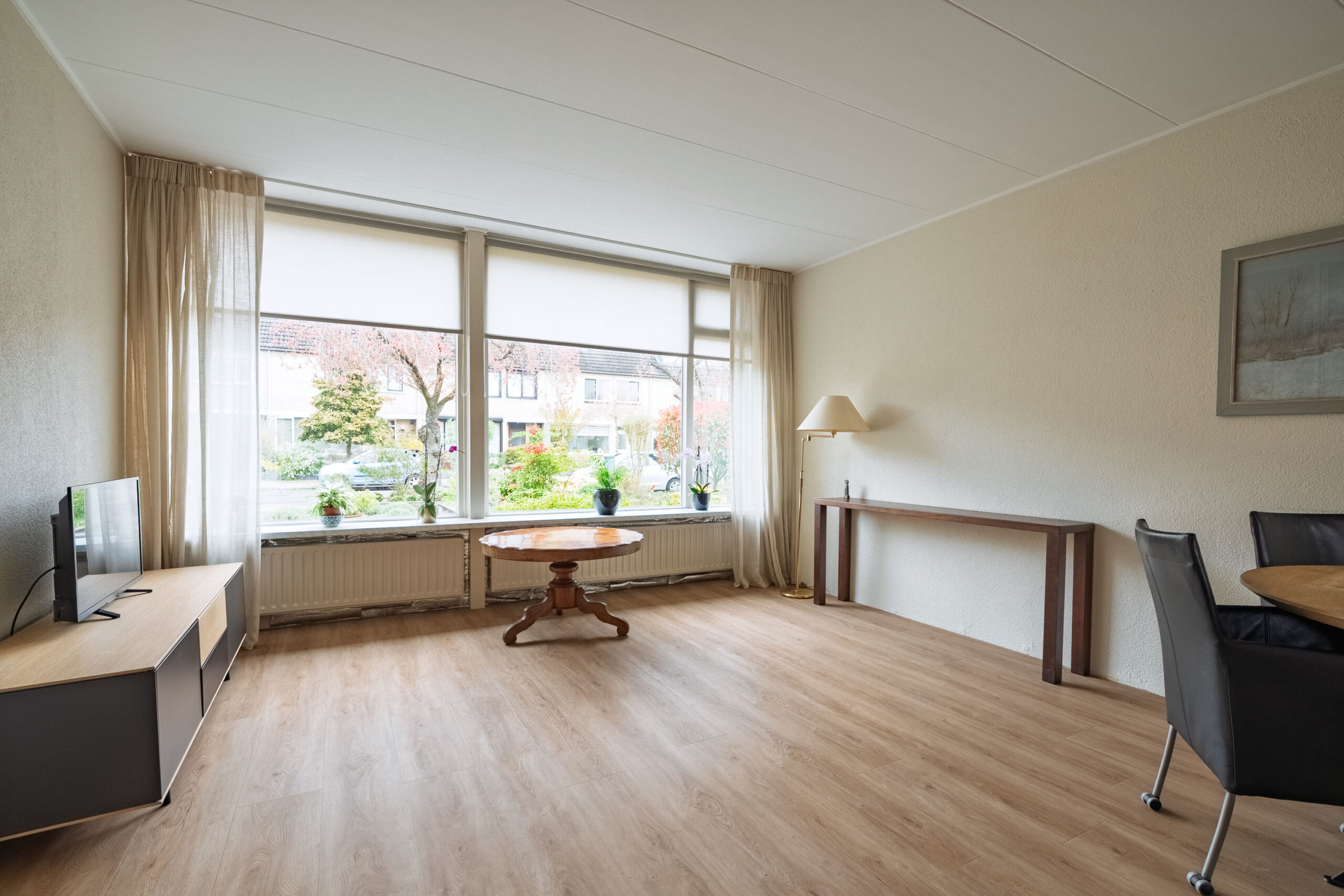 Op de begane grond bevindt zich een ruime en lichte woonkamer met grote ramen en een vriendelijke sfeer.