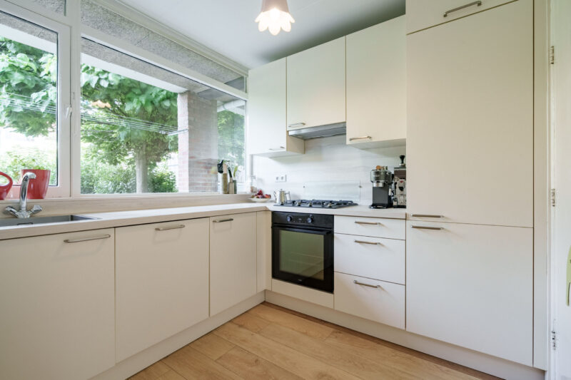 Indeling: De meterkast bevindt zich naast de voordeur, c.v.-opstelling bereikbaar vanaf de galerij, entree, hal met garderobenis en trapkast, toiletruimte en trapopgang naar de verdieping. De keuken (december ’16) bevindt zich aan de voorzijde van het appartement en is uitgevoerd in een L-vormige keukenopstelling en voorzien van diverse inbouwapparatuur, te weten: een 4-pits gaskookplaat, oven, koel-/vriescombinatie, vaatwasser en afzuigkap.