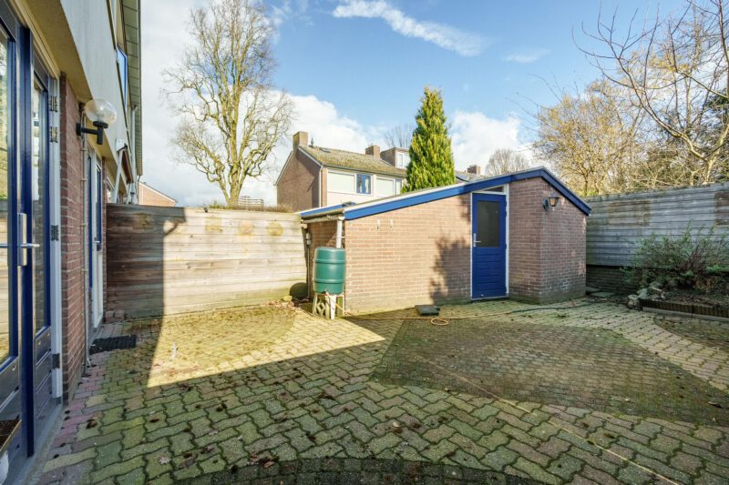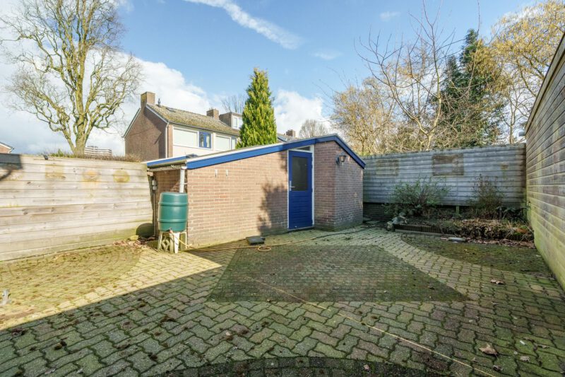 – Ruime achtertuin gelegen op het oosten met vrijstaande ruime stenen berging, houten berging en achterom;