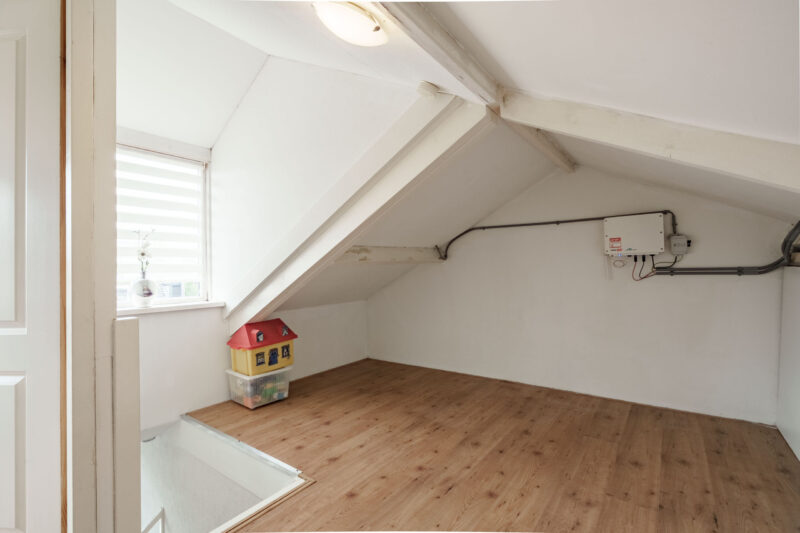 Vaste trap naar overloop met dakkapel en bergruimte, ruime 4e slaapkamer met brede dakkapel en bergruimte achter knieschotten, bergruimte waar tevens cv-combiketel geplaatst is.