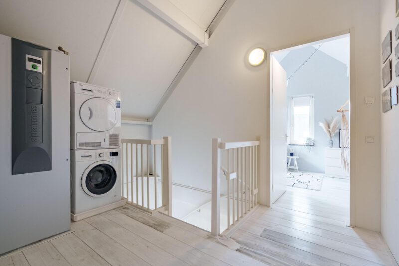 Tweede verdieping: ruime overloop met de aansluitingen voor de wasapparatuur, de warmtepompinstallatie en mechanische ventilatie unit. Een separate berging en twee slaapkamers.