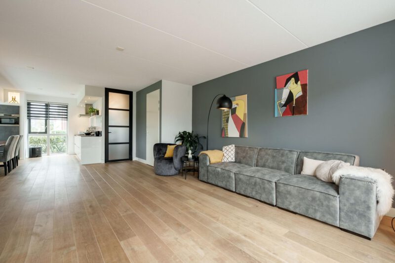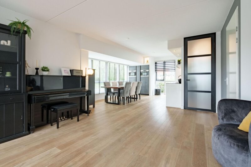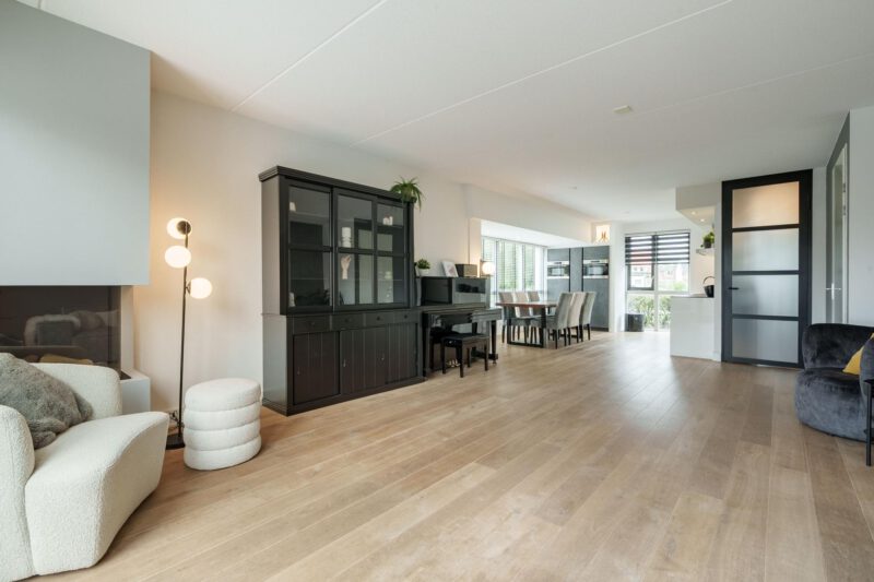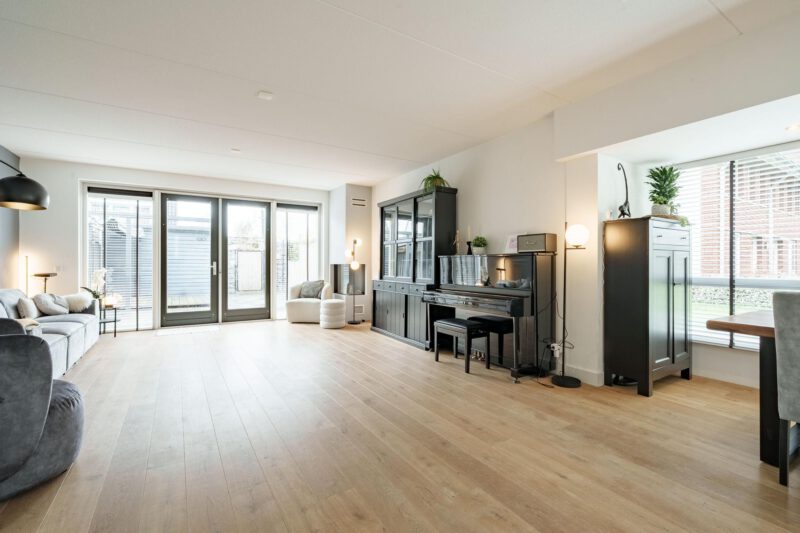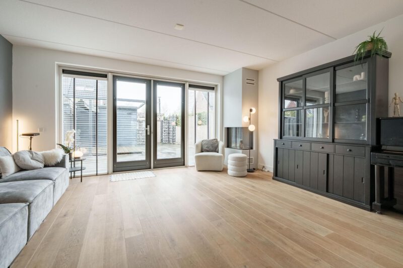 De woonkamer heeft openslaande tuindeuren en de begane grond is voorzien van een mooie houtenvloer.
