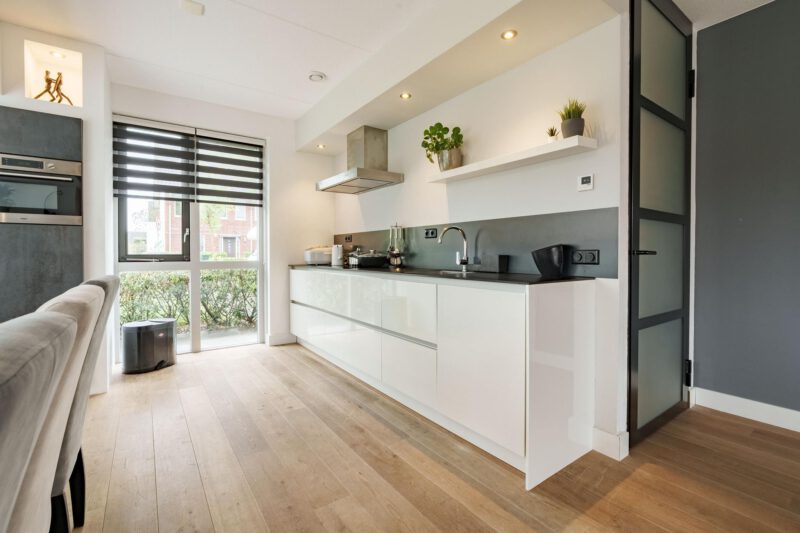 De open woonkeuken aan de voorzijde van het woonhuis is voorzien van een mooie karakteristieke uitbouw en heeft daardoor grote raampartijen.