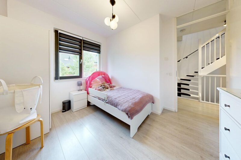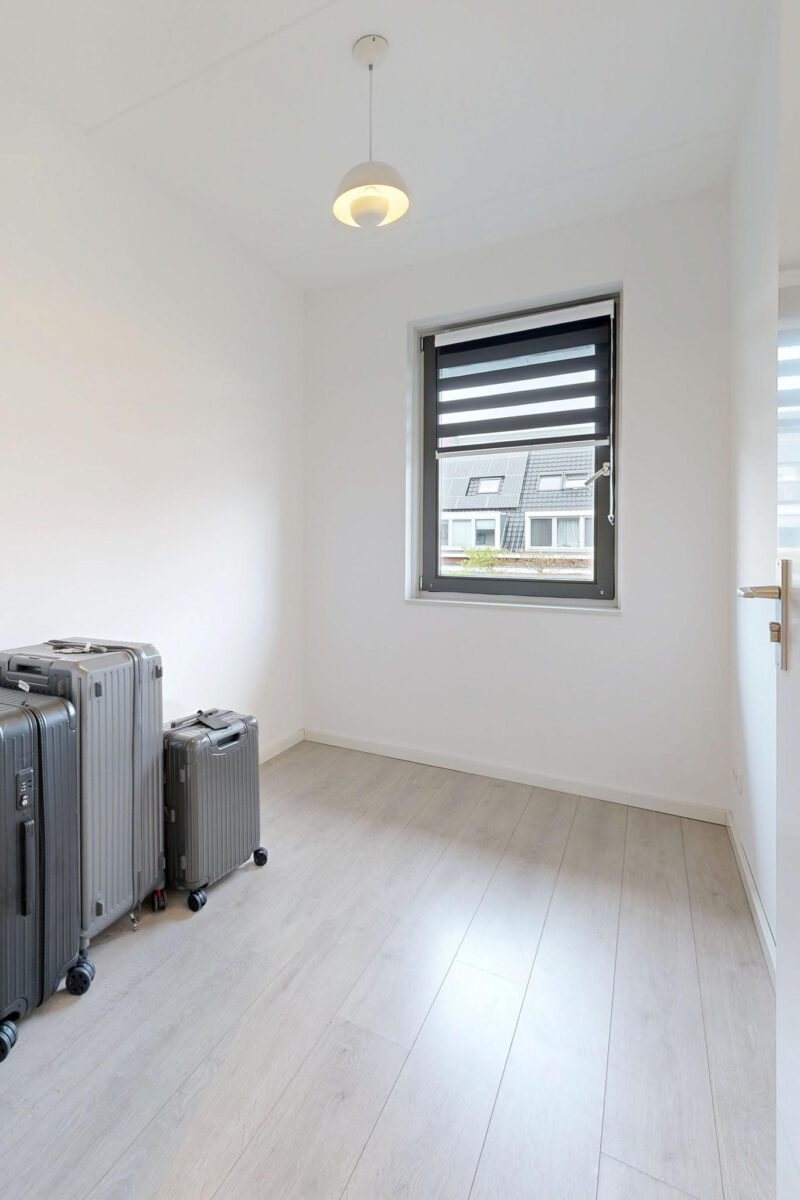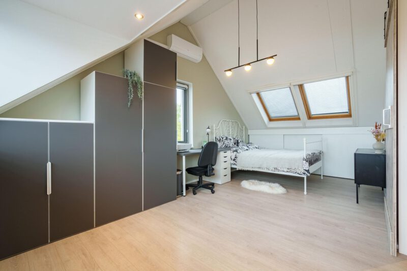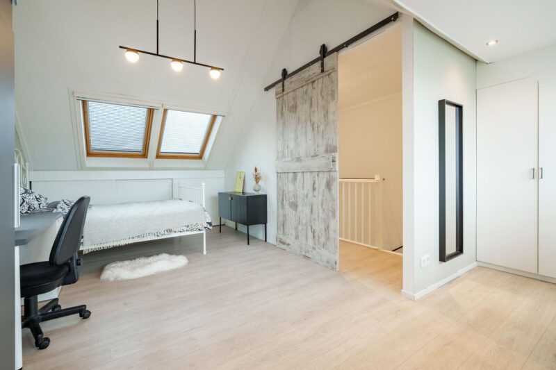 2e verdieping: overloop met aansluiting voor wasapparatuur, grote vierde slaapkamer (ca. 21 m²) met een grote dakkapel die zorgt voor extra lichtinval en woonoppervlakte. Deze kamer is voorzien van airconditioning en extra bergruimte achter knieschotten.