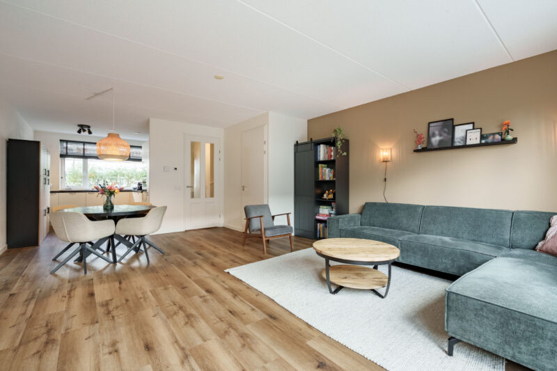 De ruime en lichte, uitgebouwde woonkamer beschikt over grote raampartijen en dubbele openslaande deuren die toegang geven tot de achtertuin. In de provisie-/trapkast bevindt zich de opstelling van de warmtepomp en is extra bergruimte aanwezig.