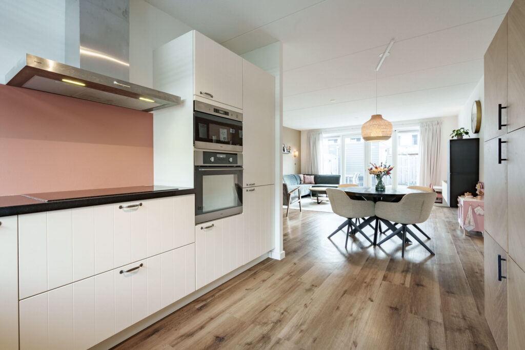 Aan de voorzijde van de woning ligt de open keuken, uitgerust met een L-vormige, lichte keukenopstelling en diverse inbouwapparatuur, waaronder een inductiekookplaat, afzuigkap, vaatwasser, oven, magnetron en een koel-/vriescombinatie.