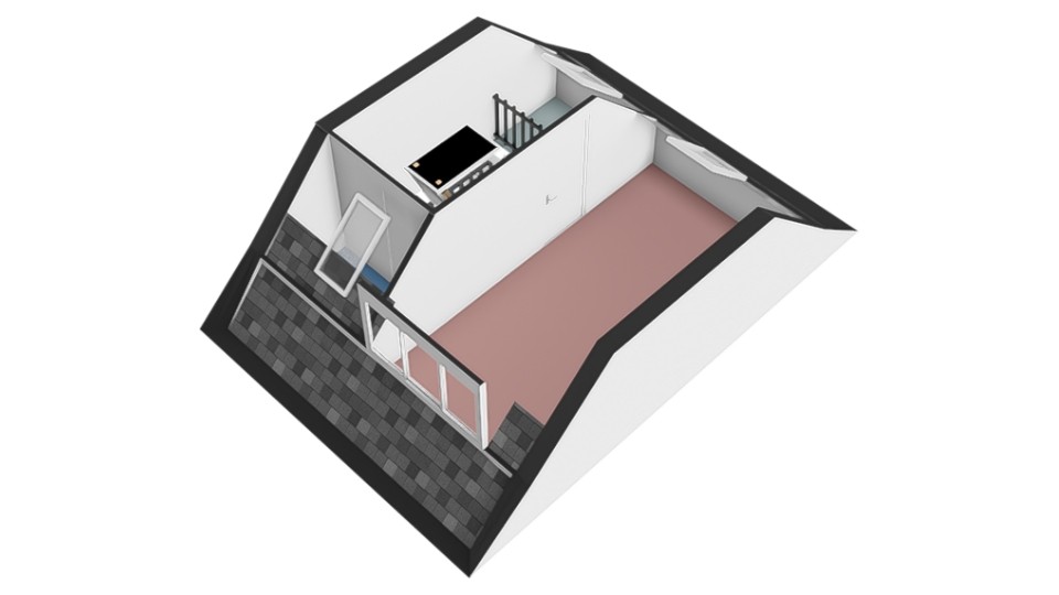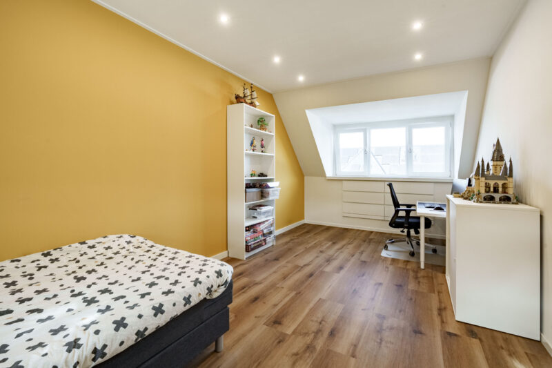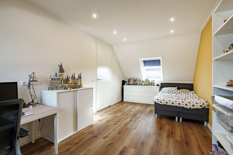 De ruime zolderkamer is voorzien van een dakkapel met een rolluik aan de buitenzijde. Er is hier een inbouwkast gerealiseerd. De kamer is zo ingedeeld dat hier desgewenst eenvoudig twee slaapkamers kunnen worden gecreëerd; het elektriciteits- en verlichtingsplan is al verdeeld in twee zones, waardoor het plaatsen van een tussenmuur voldoende is om deze ruimte te splitsen.