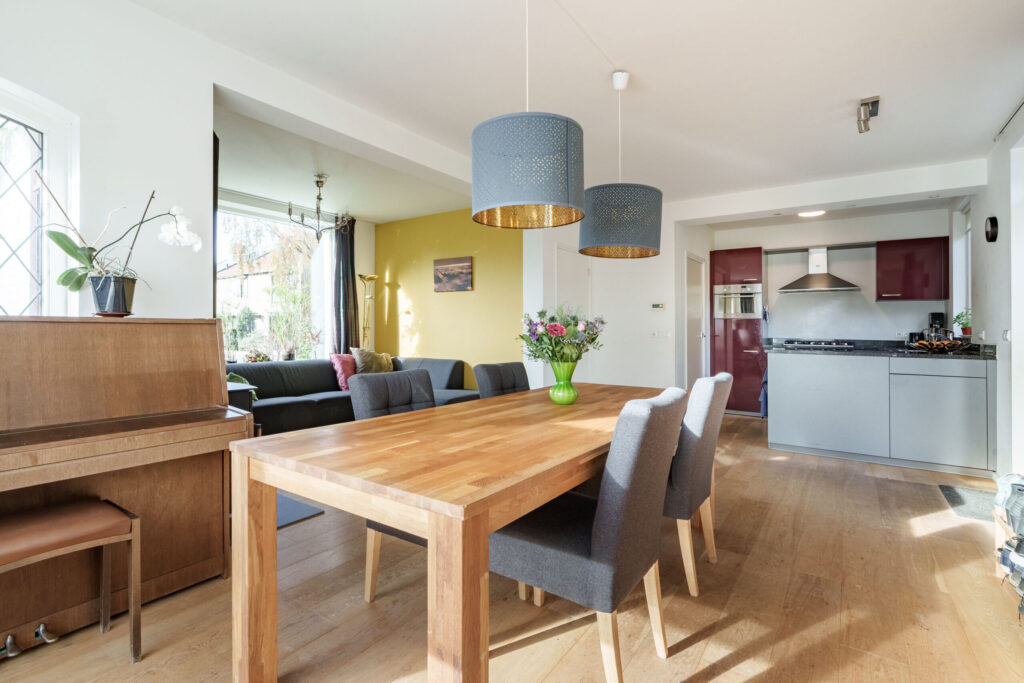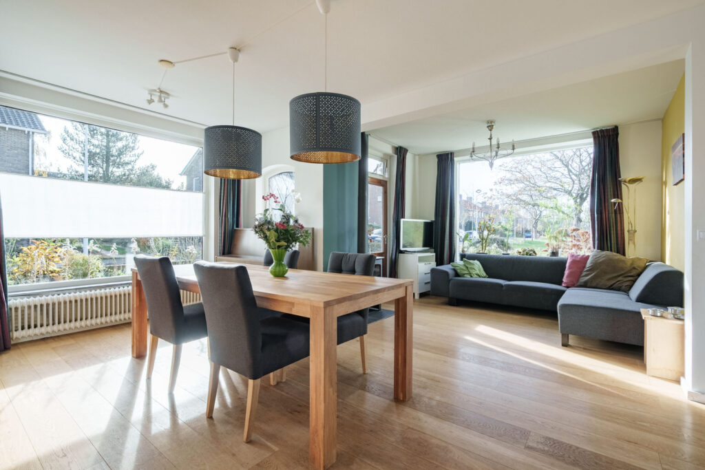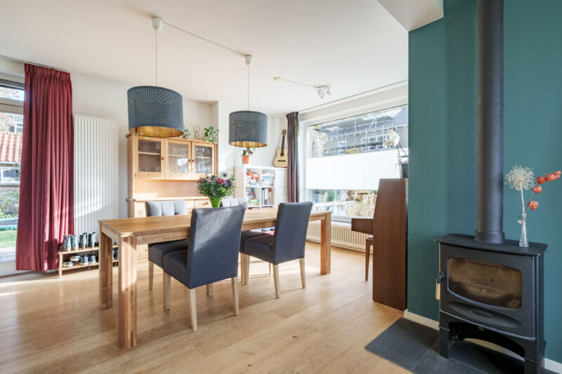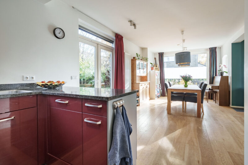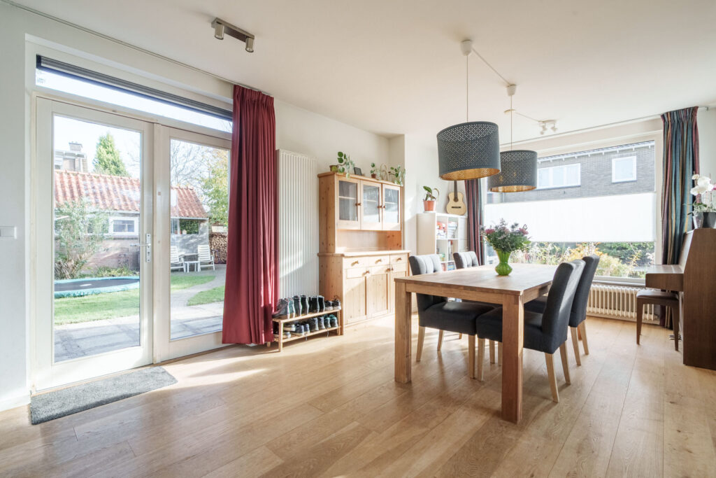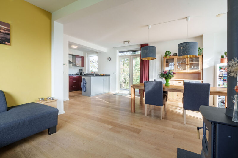 Wanneer u de woning binnenstapt, komt u terecht in de hal, waar zich het toilet met fonteintje, de meterkast en de trapopgang naar de verdiepingen bevinden. De woonkamer heeft een fijne lichtinval dankzij de diverse raampartijen. De houten parketvloer loopt door tot in de eetkamer en keuken, wat zorgt voor een sfeervol geheel. De eetkamer biedt voldoende ruimte voor een royale eettafel.