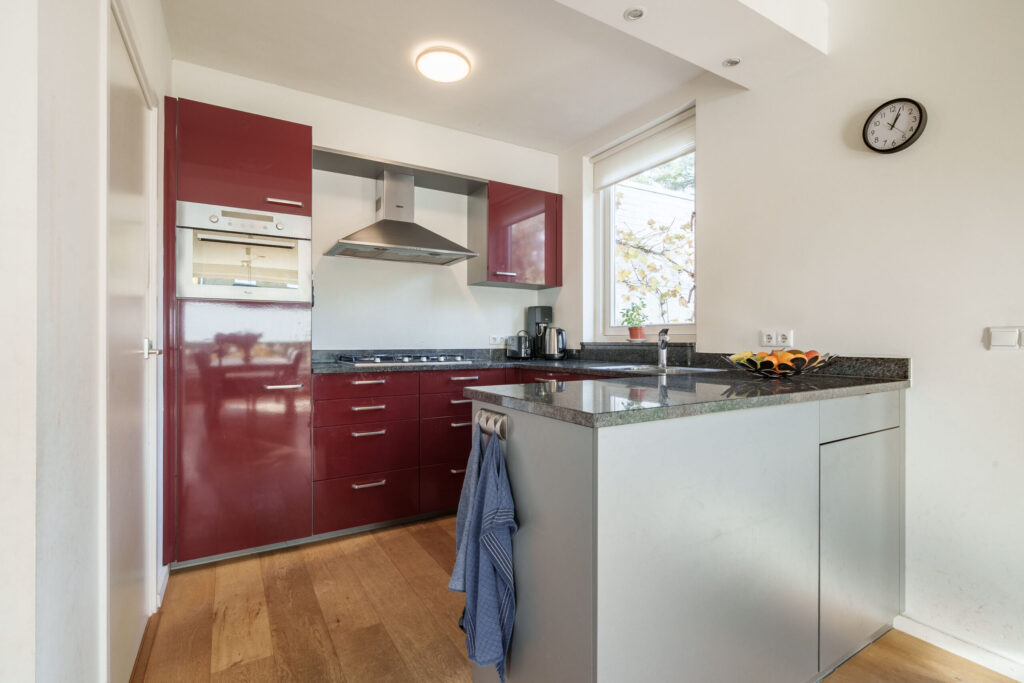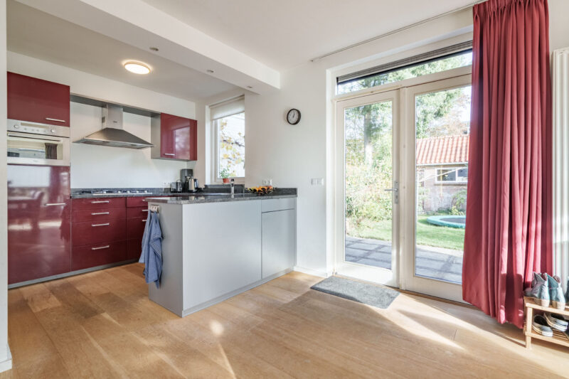 De keuken is uitgevoerd in een praktische opstelling met schiereiland en voorzien van diverse inbouwapparatuur, waaronder een gasfornuis, afzuigkap, combi-oven/magnetron, koel-vriescombinatie en vaatwasser. De praktische trapkast biedt extra opbergmogelijkheden en geeft tevens toegang tot de kelder. Deze kelder is goed toegankelijk en droog, waardoor ook hier extra bergruimte beschikbaar is. Via de openslaande deuren heeft u direct toegang tot de tuin.