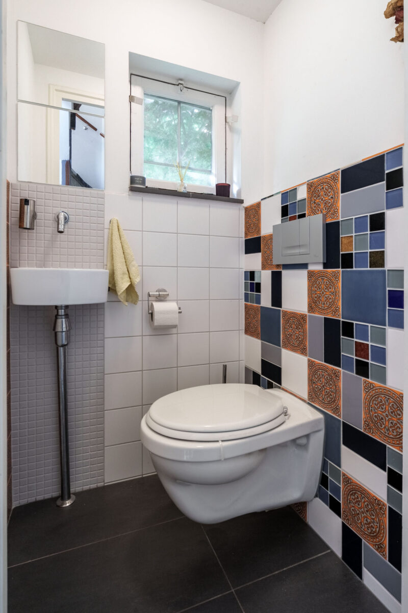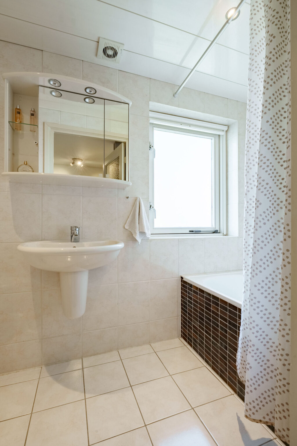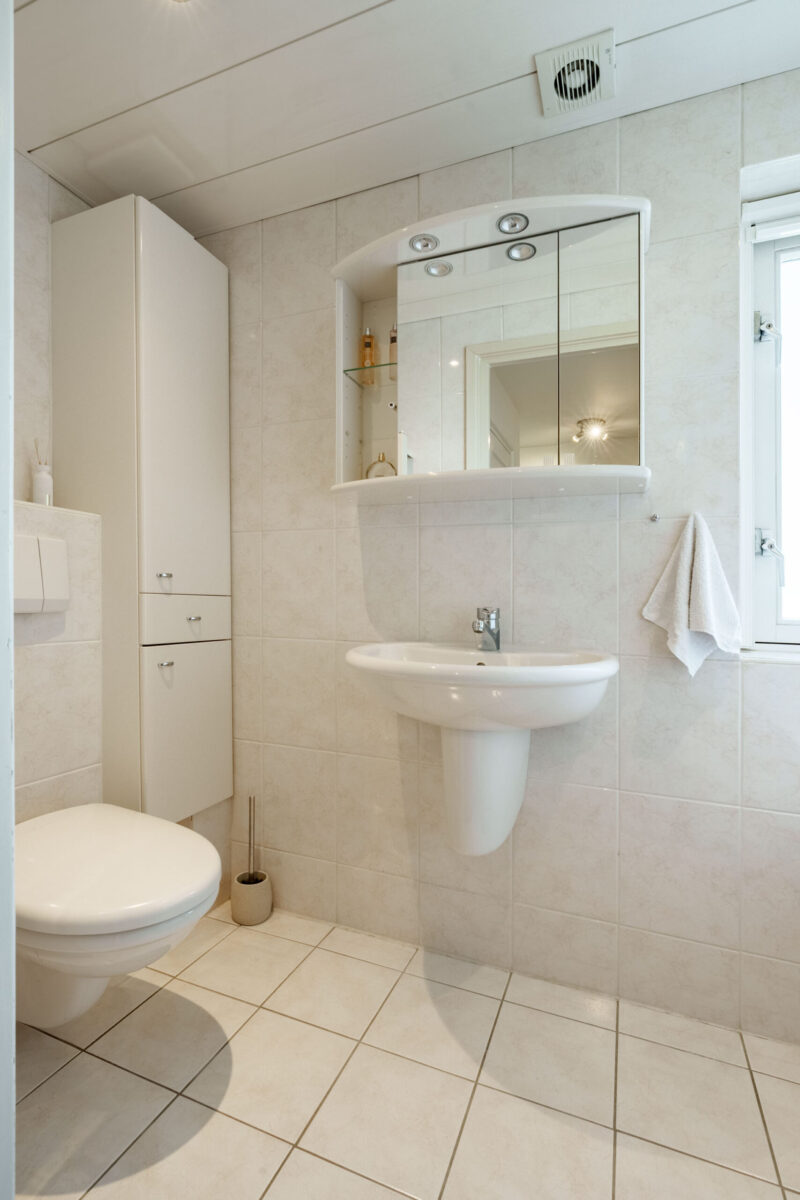De betegelde badkamer is ingericht met een zwevend toilet, een fonteintje en een bad-douchecombinatie. Het aanwezige raam zorgt voor prettig daglicht en natuurlijke ventilatie.