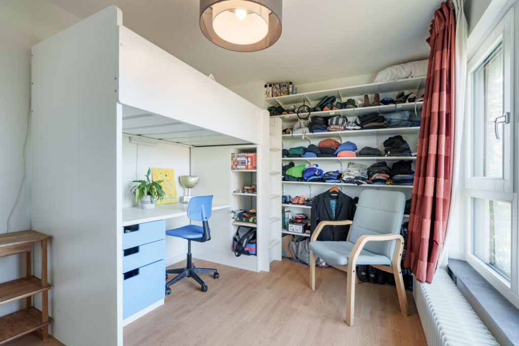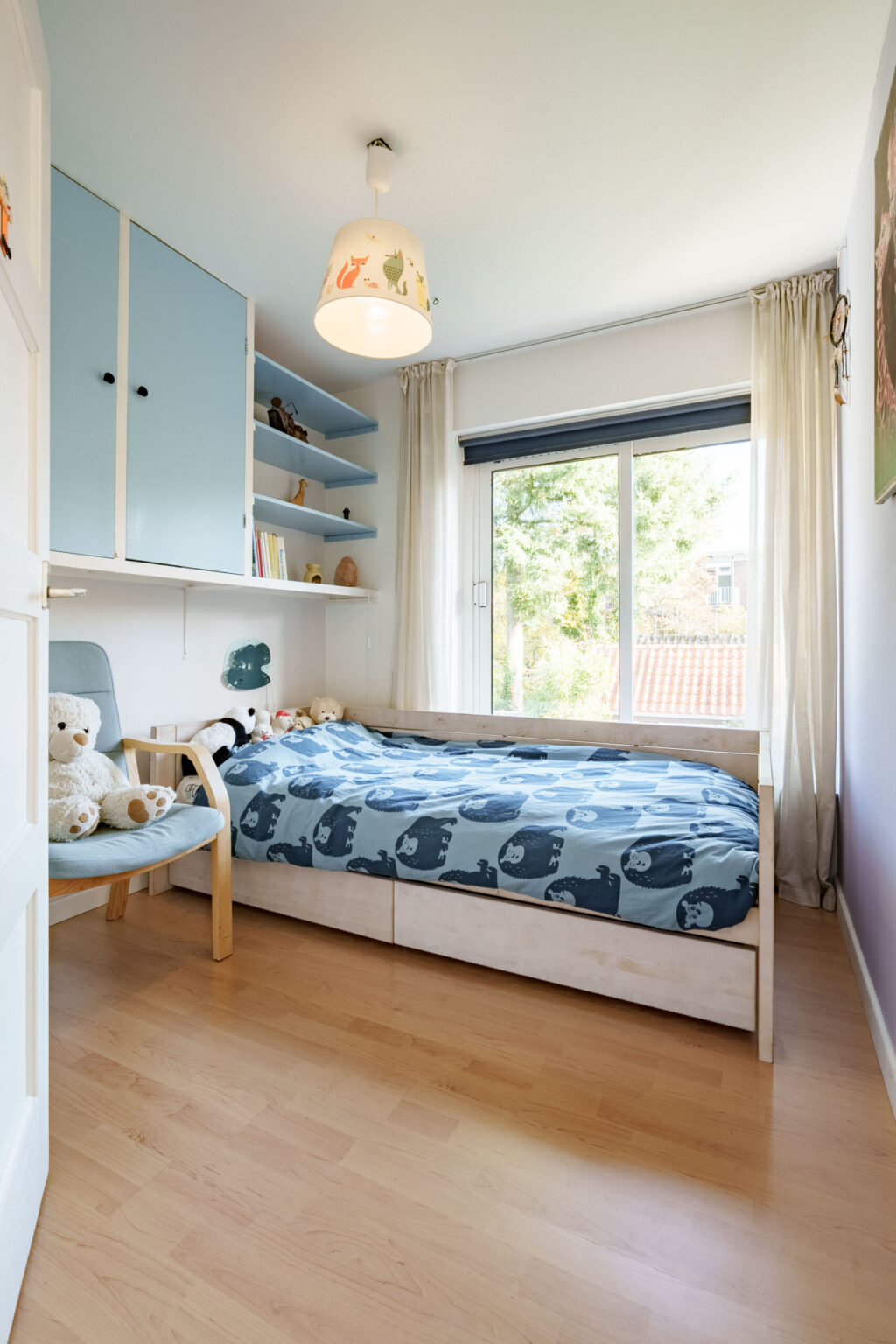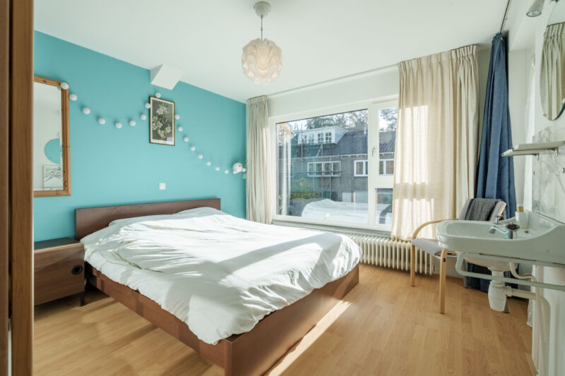 Op de tweede verdieping bevindt zich de vijfde slaapkamer. Dankzij de ramen aan beide zijden is dit een bijzonder lichte ruimte. Achter de knieschotten is extra opbergruimte beschikbaar voor spullen die u niet dagelijks gebruikt.