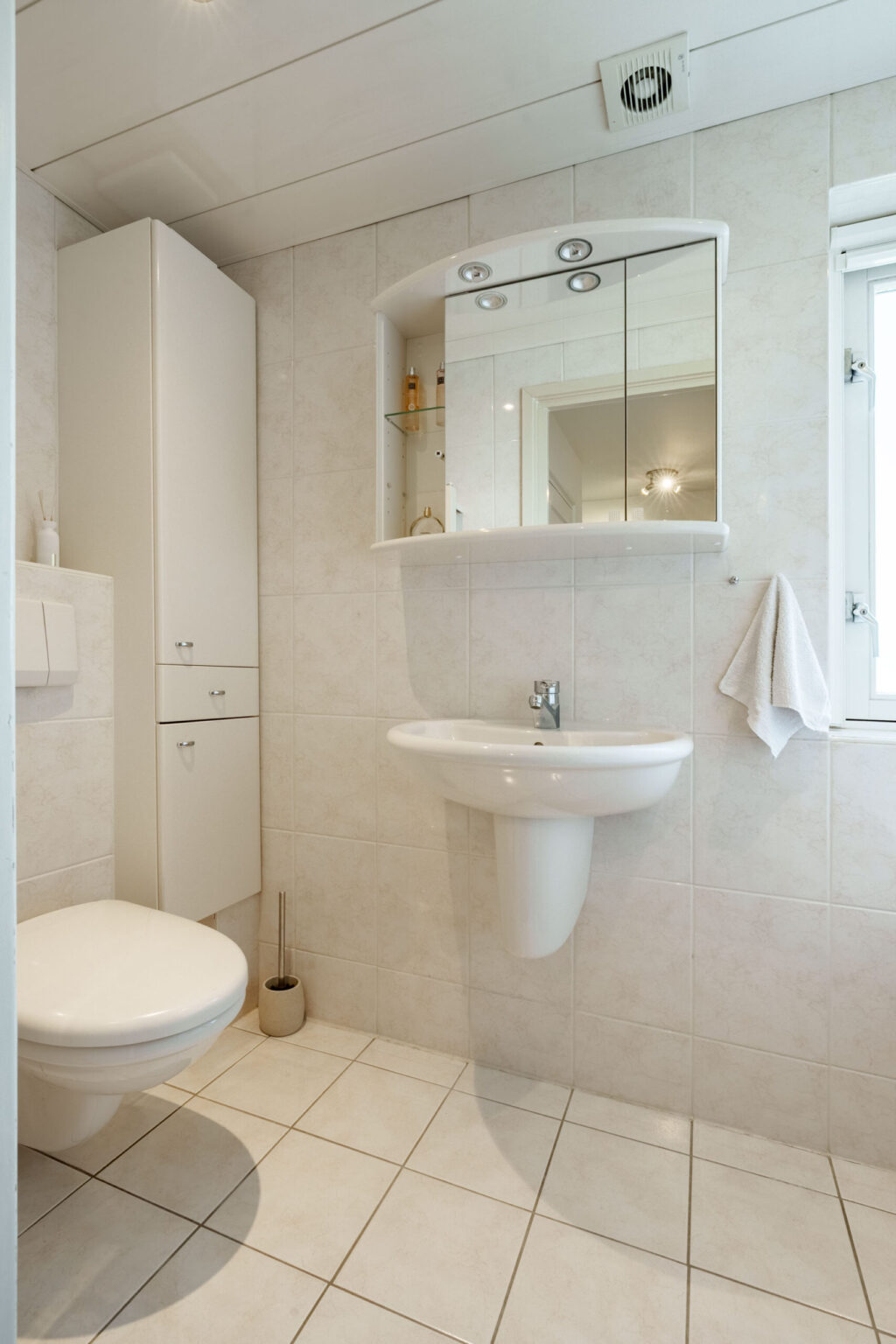Naast de badkamer bevinden zich twee ruime inbouwkasten, ideaal om een praktische opstelplaats voor de wasmachine en droger te creëren.