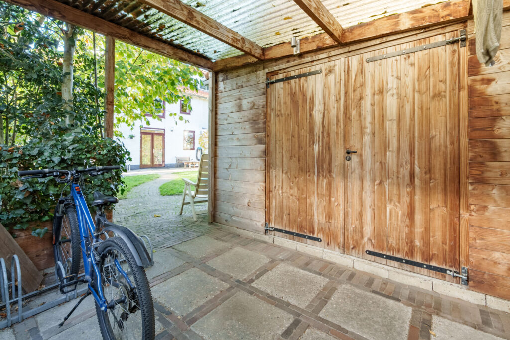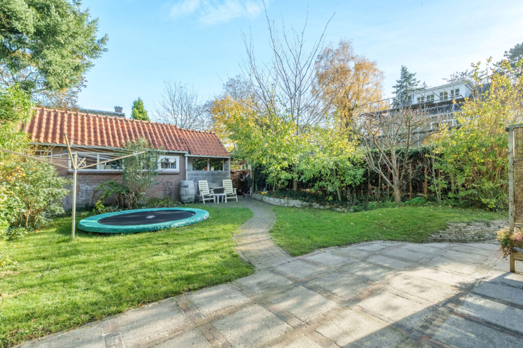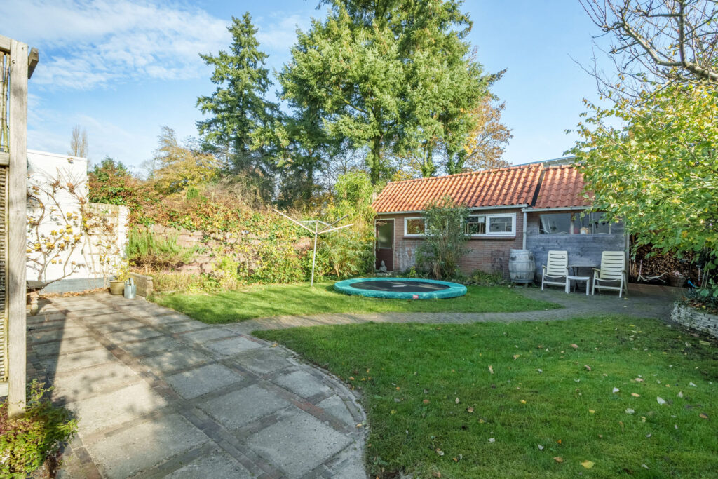 – Groene tuin met diverse beplanting, trampoline, stenen terras en stenen schuur met overkapping;