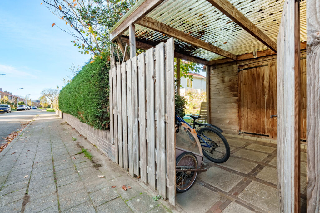 De groene tuin is voorzien van diverse (fruit-)bomen, planten en kleurrijke bloemen. Er is een trampoline aanwezig. Het stenen terras biedt voldoende ruimte voor het creëren van een gezellige eethoek. Achterin de tuin staat een praktische stenen schuur met houten aanbouw, overkapping en een handige achterom.